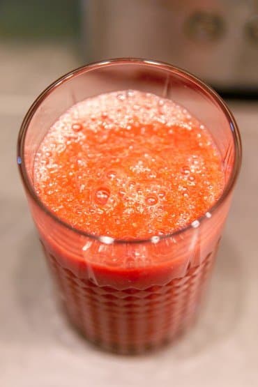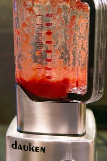 Как и положено, из помидоров сорта Сливка удалили плодоножки и нарезали плоды на две, а особо крупные — на четыре части. Сложили всё в кувшин, накрыли крышкой и включили режим Смузи на 30 секунд.