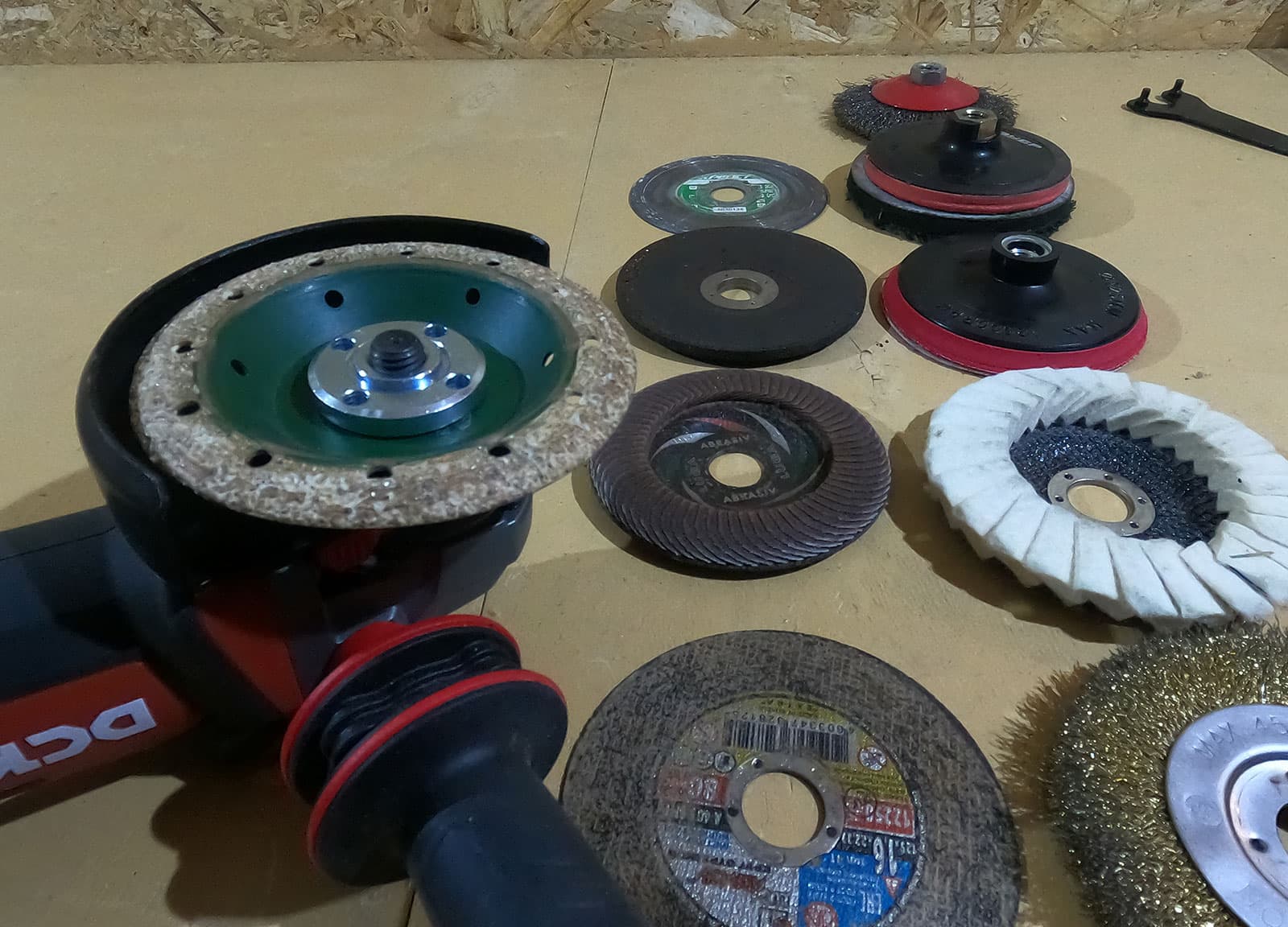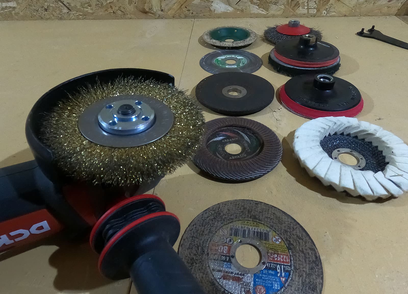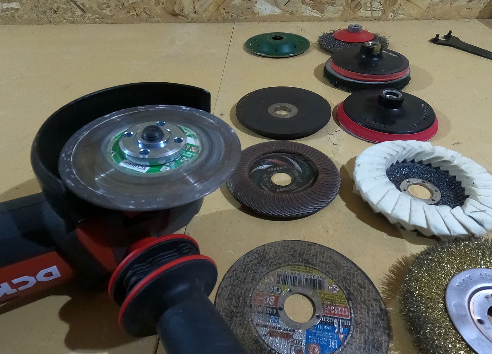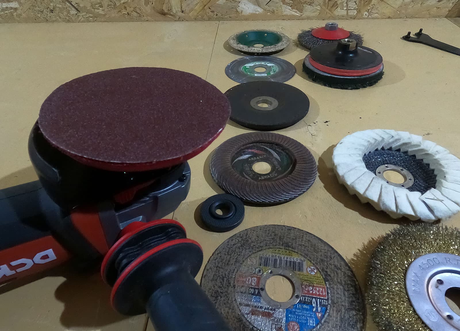 Для тестирования УШМ были приготовлены насадки разного назначения — по дереву, металлу и бетону.