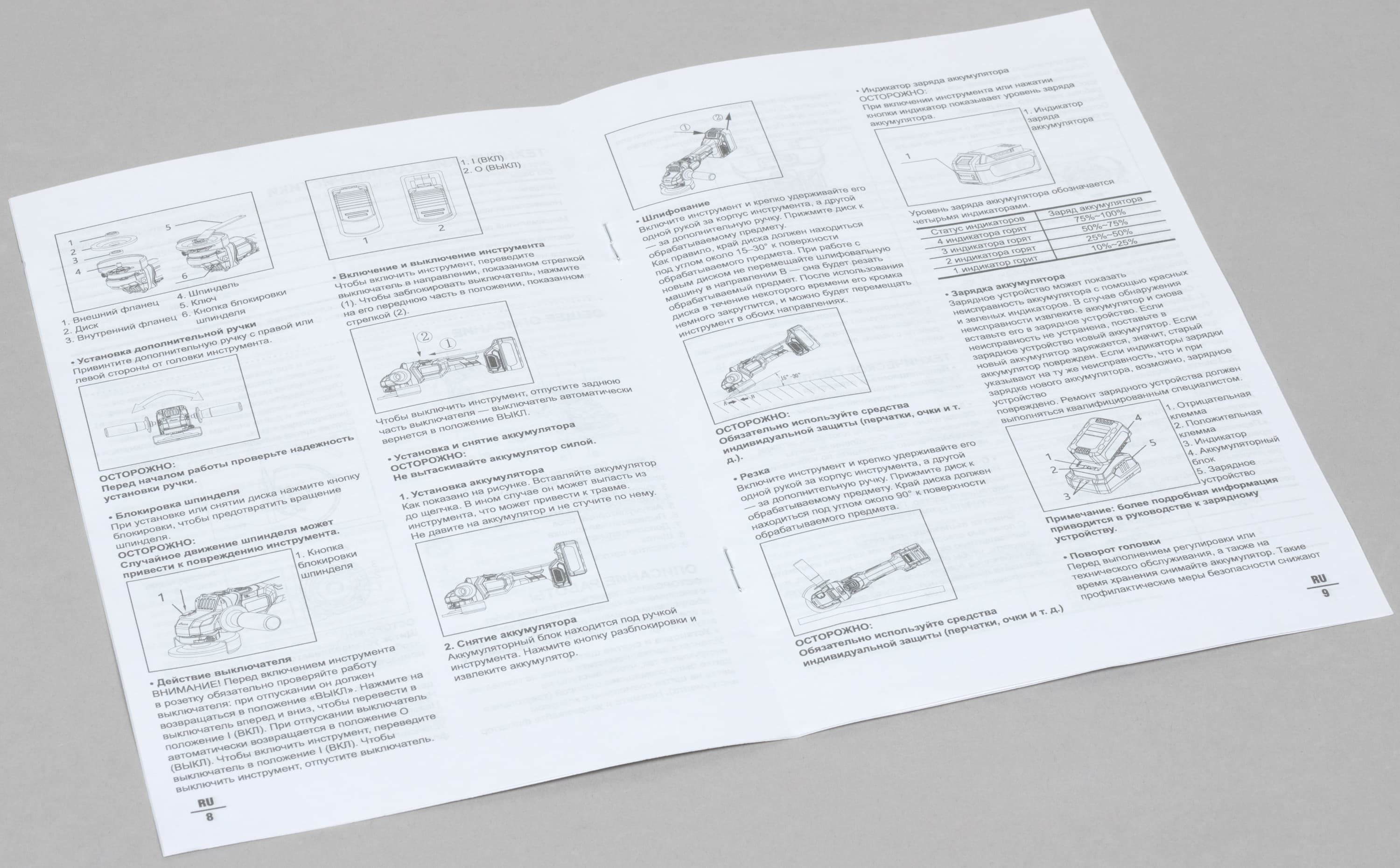 В комплекте к УШМ имеется подробная инструкция с перечислением мер безопасности при работе и методов выполнения тех или иных задач. Иллюстрации мелковаты, но это уже стандарт для подавляющего большинства инструкций и руководств.