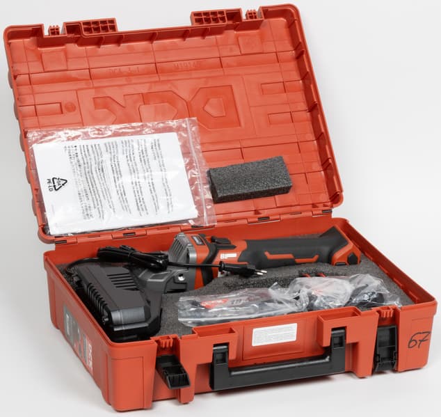 В комплекте с УШМ имеется защитный кожух, рукоять, ключ, две батареи с зарядным устройством и печатная продукция.