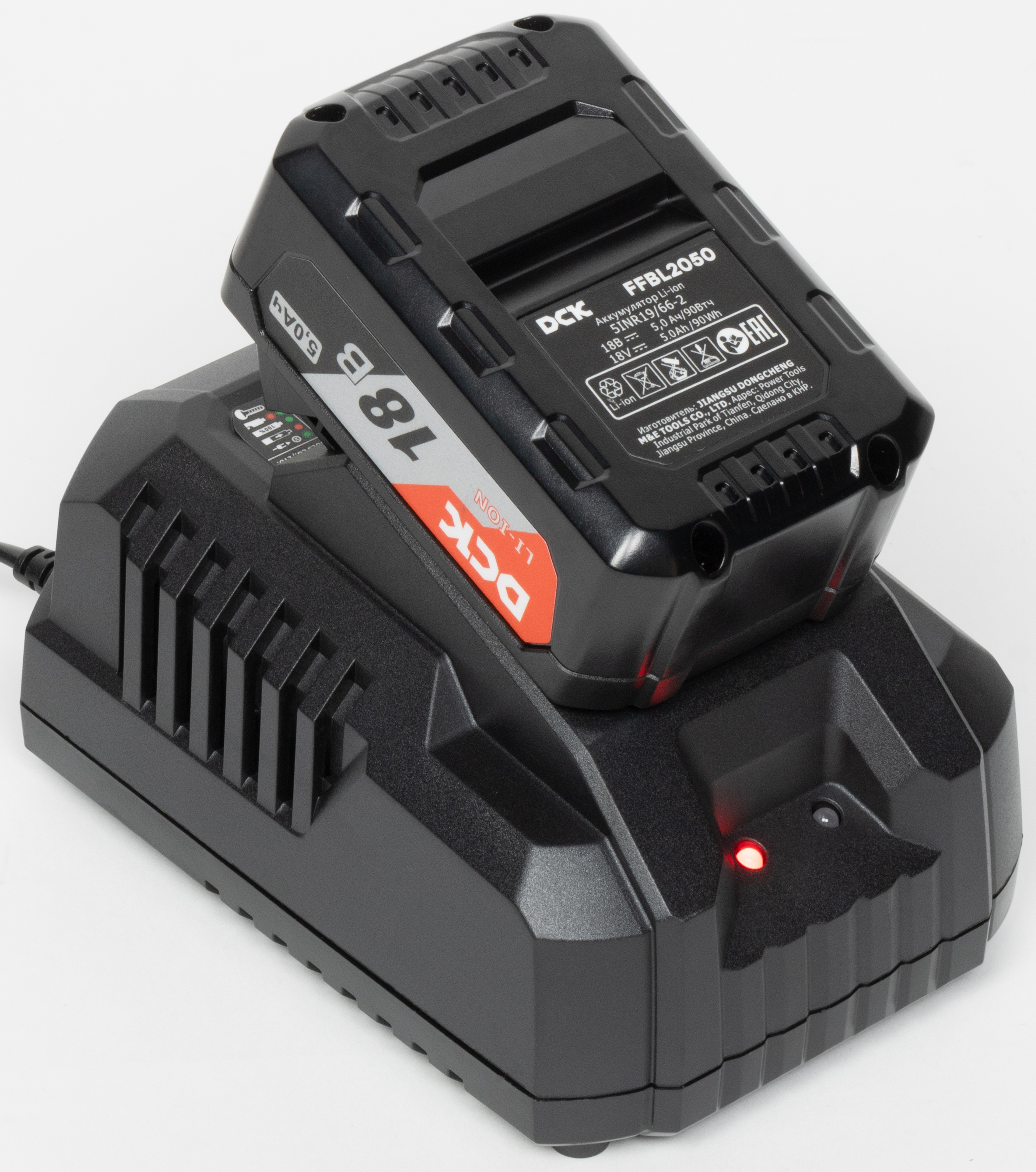 Наш инструмент снабжается двумя 18-вольтовыми аккумуляторами емкостью 5 А·ч и одним зарядным устройством. Зарядка батареи длится около 90 минут.
