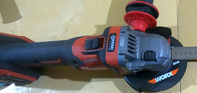 В характеристиках устройства не заявлены ни плавный старт, ни электрический тормоз двигателя. Тормоза нет, это точно. При выключении мотора насадка продолжает вращаться под действием центробежной силы. Чем тяжелее насадка — тем дольше она будет вращаться. Таким образом, явного тормоза здесь нет. Но отметим: после выключения двигателя ощущается некоторая искусственная задержка, которая напоминает работу слабой трещотки. Скорее всего, это особенность работы редуктора. Такая особенность приводит к тому, что вращение насадки прекращается лишь на секунду раньше в сравнении с обычной сетевой болгаркой, где тормоз отсутствует совершенно точно. Впрочем, даже секунда в таких делах — тоже неплохо.