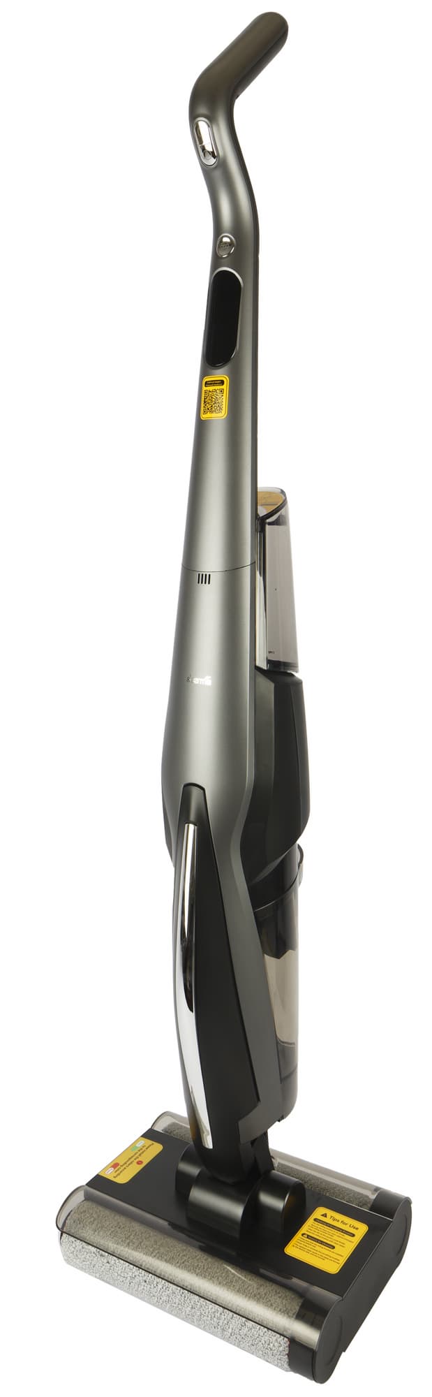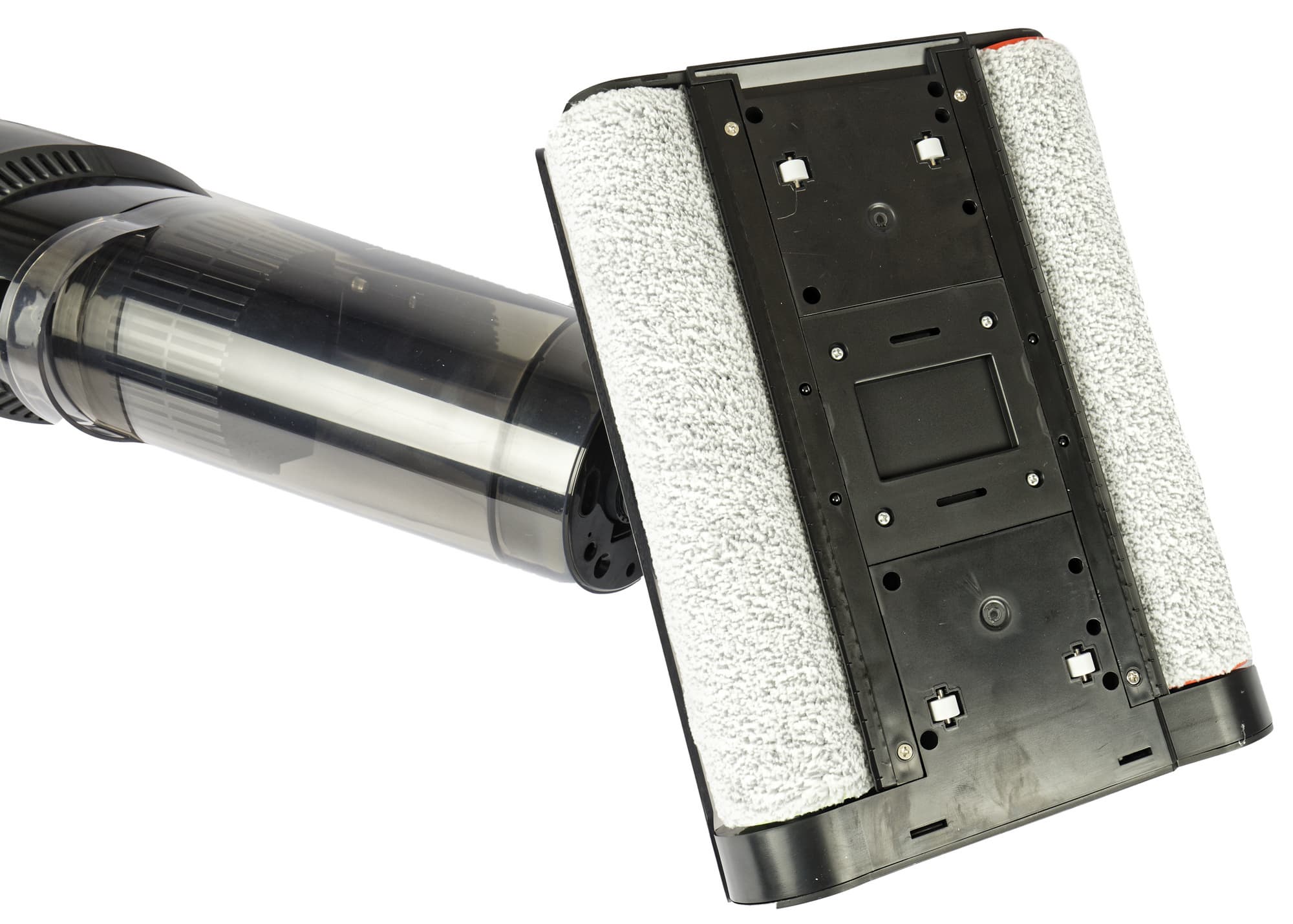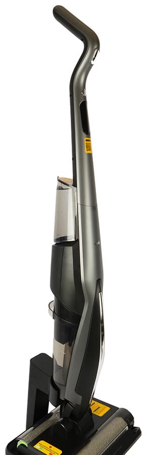 В обоих направлениях пылесос перемещается без усилия: вращающиеся щетки компенсируют сопротивление друг друга на любых покрытиях — от ламината до ковролина. Мягкие роторы равномерно и эффективно протирают пол, не оставляя разводов и потеков, а качество уборки показалось нам заметно лучшим, чем в однороторных моделях.