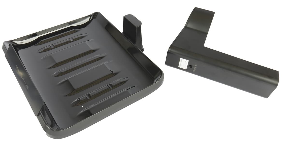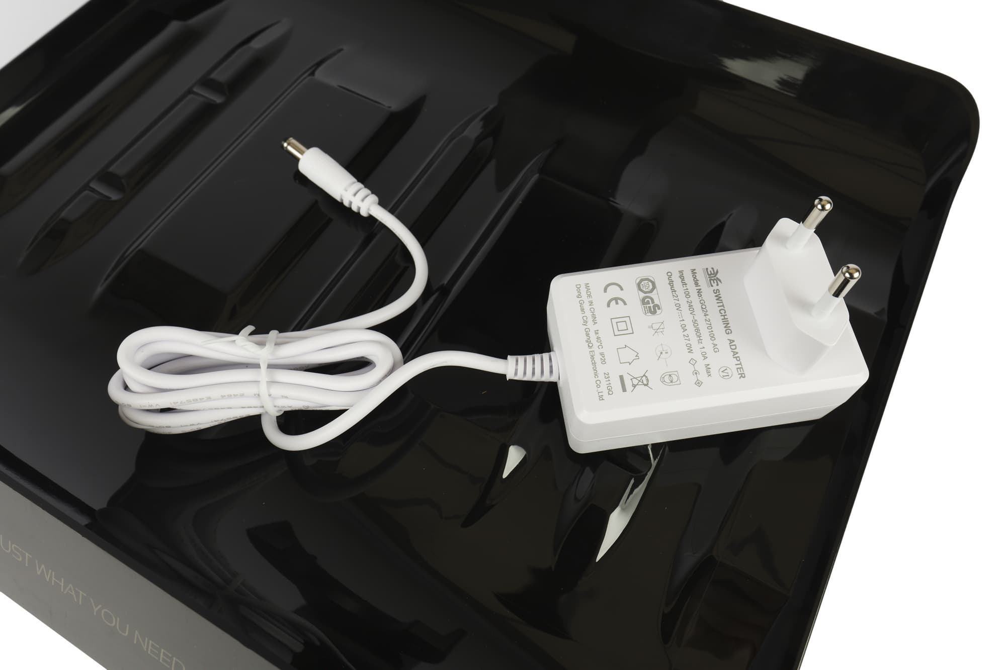 В нижней части подставки есть два углубления, в которых собирается излишек воды при промывке устройства. К вертикальной стойке подключается адаптер постоянного тока, обеспечивающий зарядку.