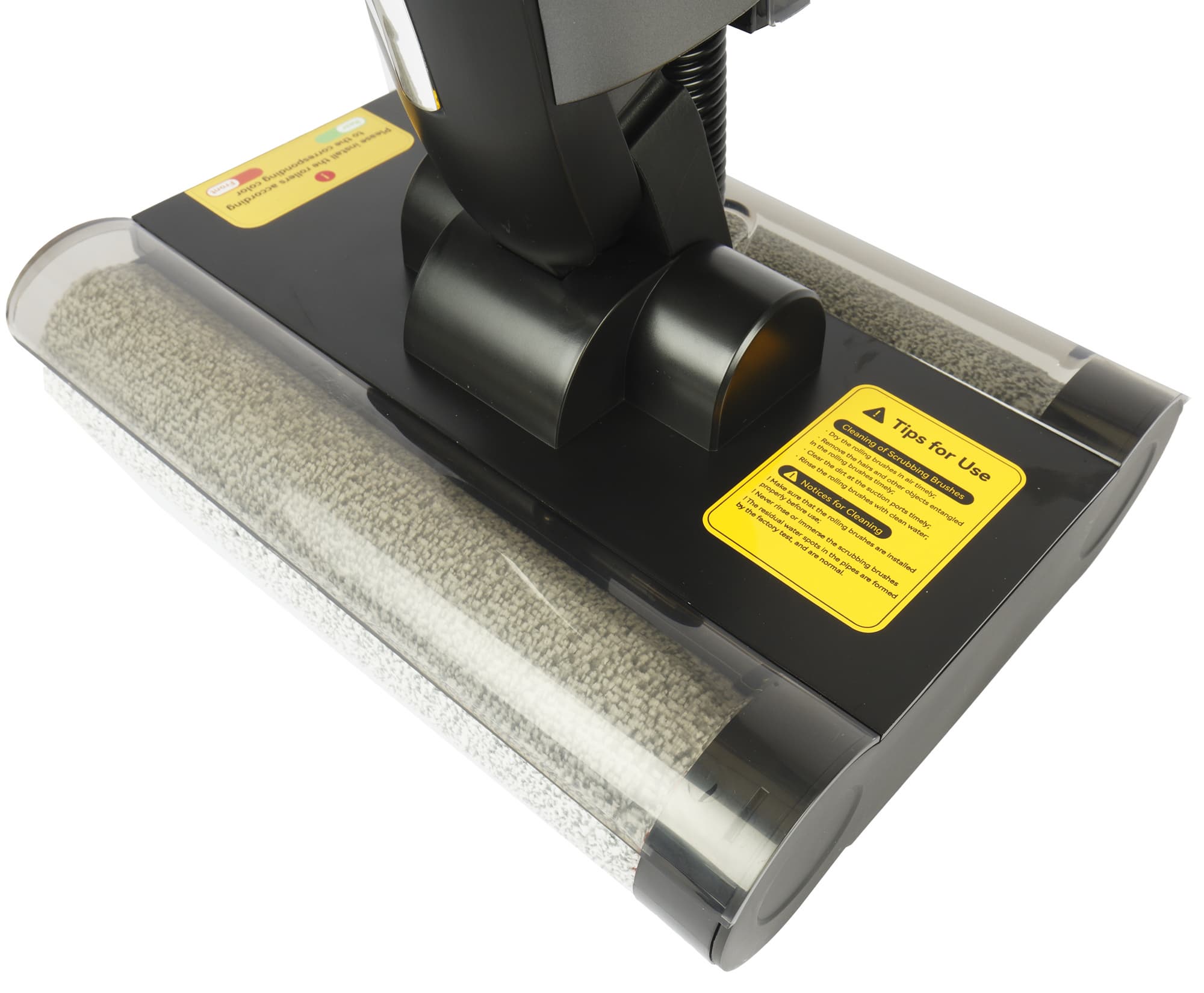Роторы вращаются в разные стороны: это способствует более качественной и эффективной уборке. Их крепления чуть различаются, и для правильной установки придется запомнить: зеленая щетка крутится сзади, а красная — спереди. Чтобы извлечь их для очистки и сушки, достаточно сжать двумя пальцами заглушку на торце и освободить крепление.