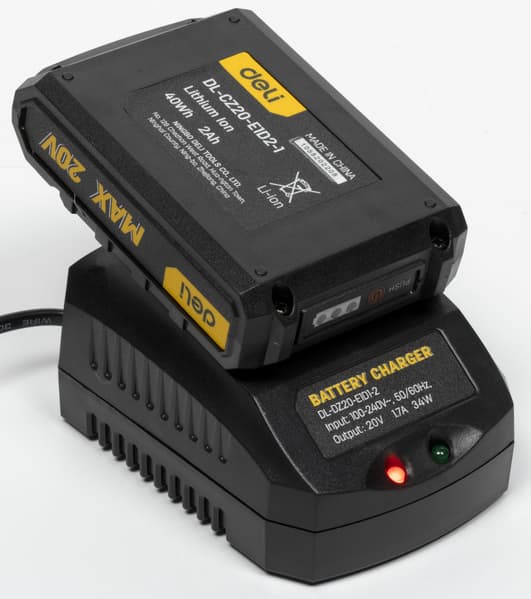 Прилагаемое зарядное устройство представляет собой станцию на 100—240 В с выходом 20 В/2,0 А. Батарея полозьями вставляется в слот и фиксируется в нем так же, как в подошве шуруповерта. Во время зарядки светится красный светодиод, а по завершении зарядки включается зеленый.