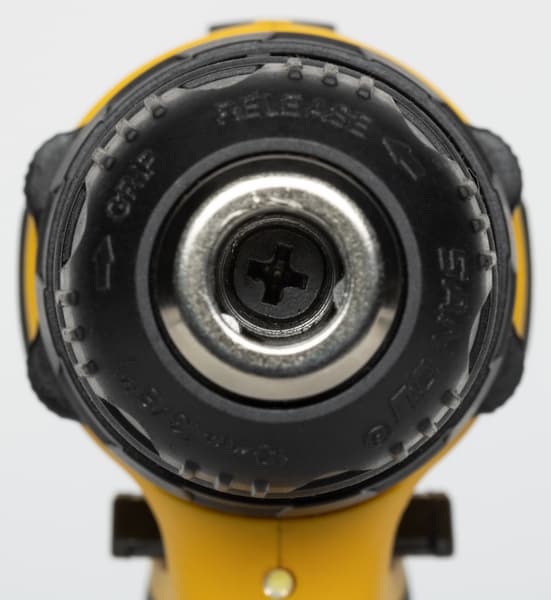 Шуруповерт не оснащен механизмом автоматической блокировки шпинделя при выключенном двигателе. То есть, для смены оснастки потребуется две руки: первой рукой удерживается узкое кольцо (очень неудобно), а второй рукой отвинчивается или завинчивается кончик патрона. Бывалые пользователи советуют поступать проще: дескать, чтобы ослабить зажим, достаточно перекинуть реверс двигателя, и, ухватив рукой конец патрона, включить двигатель. Да, это работает, но это опасно. Если кисть и не вывернет, то можно пораниться закрепленной в патроне оснасткой.