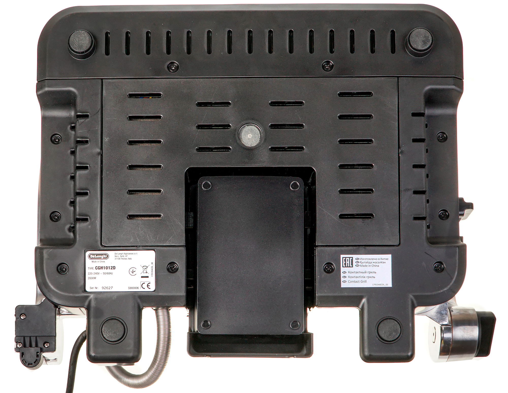 Со стороны дна мы видим целых две наклейки с информацией о приборе, несколько рядов вентиляционных отверстий и невысокие ножки, снабженные резиновые накладками. Благодаря накладкам и собственному весу, гриль размещается поверхности стола или стеклокерамической плиты устойчиво, не сдвигается и не скользит при манипуляциях с панелями, крышкой или при установке прибора для работы в альтернативных режимах.