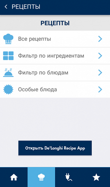 Вкладка с поварским колпаком переводит нас в раздел «Рецепты». В пункте «Все рецепты», собственно, рецепты представлены в алфавитном порядке. Три нижних пункта предлагают отфильтрованные по определенным признакам списки. Рецепты в приложении отфильтрованы по ингредиентам (сыр, яйца, фрукты, выпечка, птица и т. д.), блюдам (фуршетные блюда, основные, гарниры, десерты). В категорию «Особые блюда» выделены блюда без глютена, быстрые, вегетарианские, без яиц и без молока.