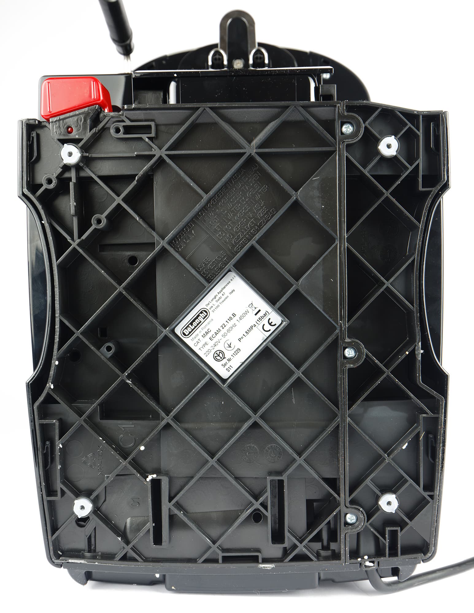 Не слишком интересная картина открывается и снизу: тут мы видим наклейку с информацией о модели. Красный пластиковый колпачок — это миниатюрный контейнер для сбора конденсата (он крепится к нижней части кофемашины).