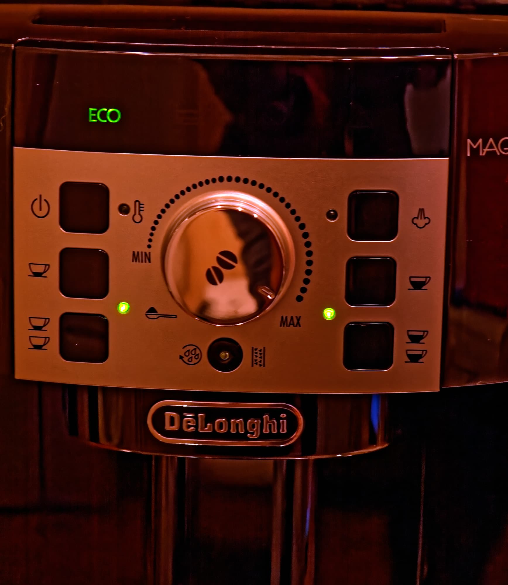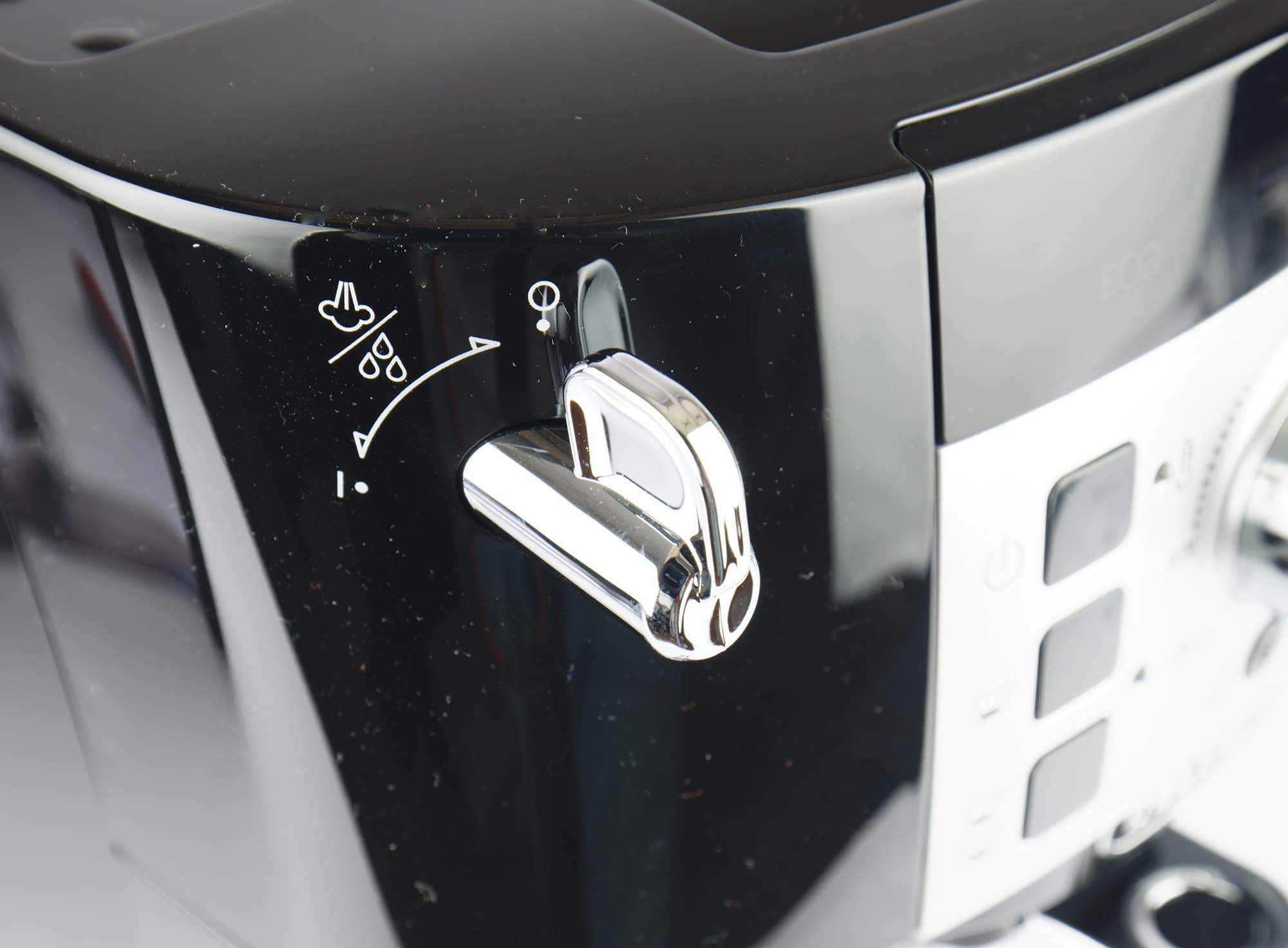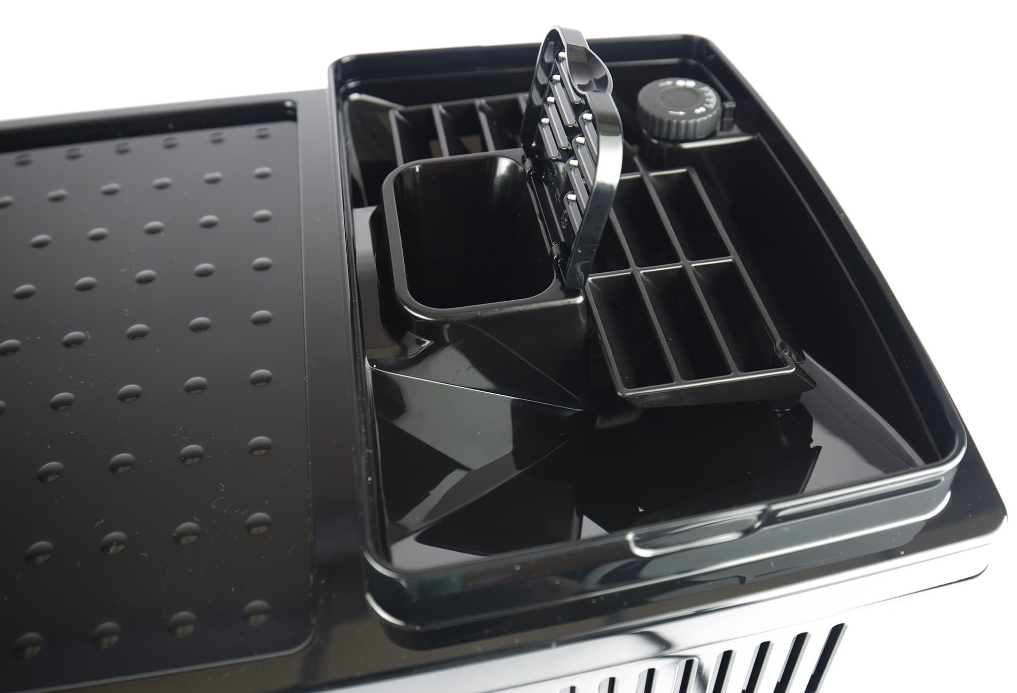 В левом дальнем углу — колесо настройки встроенной кофемолки (сама кофемолка находится под колесом, на фото ее не видно). В нашей машинке используется жерновая кофемолка с металлическими коническими жерновами и 13 степенями помола (такая используется у огромного количества современных кофемашин De’Longhi), так что каждый сможет подстроить помол в зависимости от сорта кофе и/или собственного вкуса.