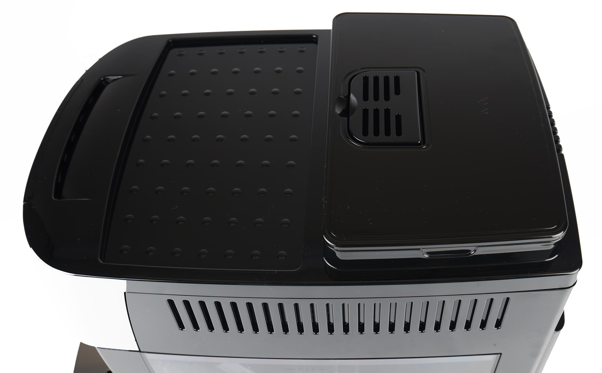 Сверху у нашего прибора находится пластиковая площадка для чашек (с пассивным подогревом), а также две крышки: маленькая открывает доступ к шахте для засыпки молотого кофе, крупная — снимается полностью и позволяет засыпать зерно.