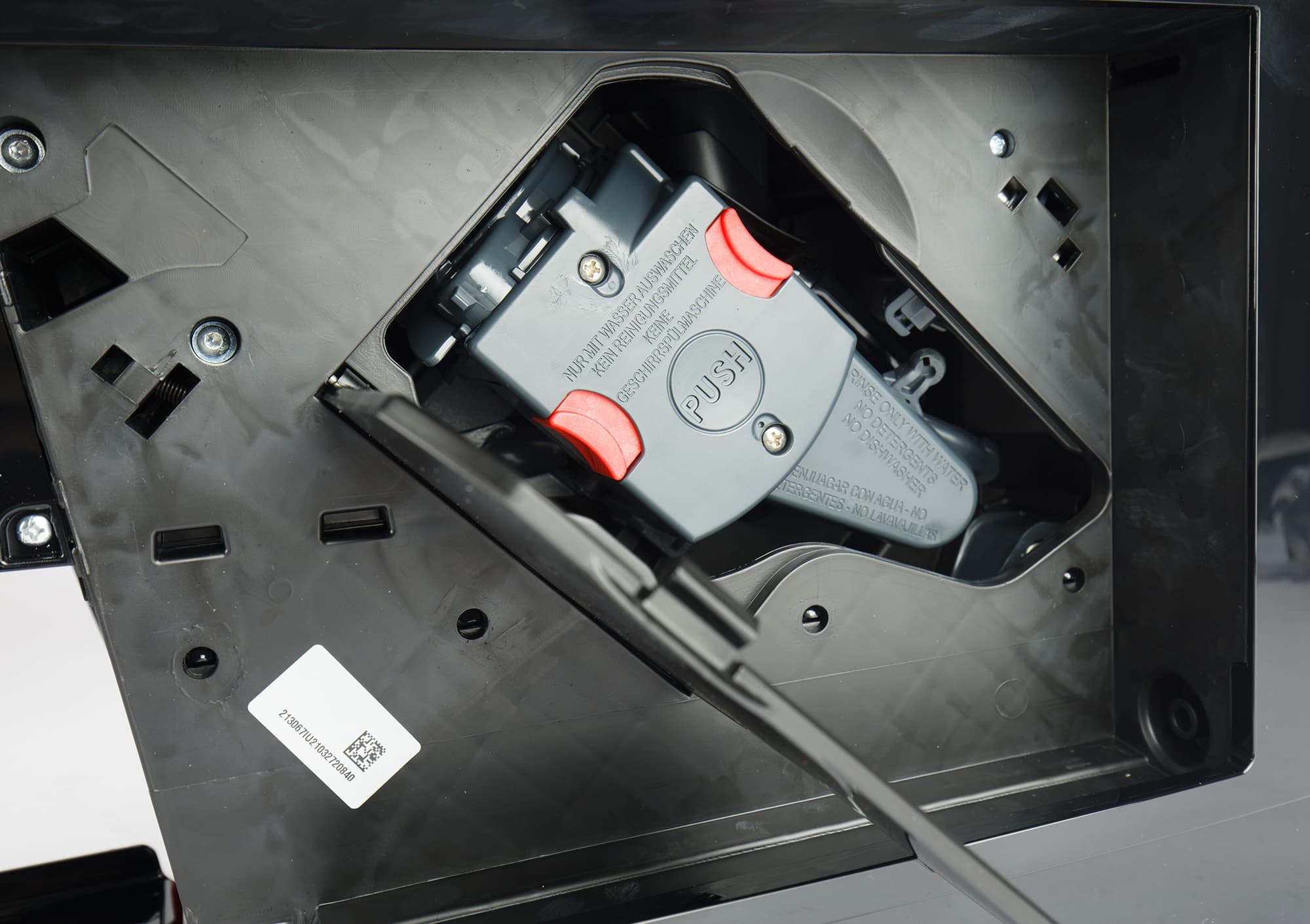 За контейнером для воды находится спрятанный пластиковый лючок, а за ним — компактный заварочный блок, легко извлекающийся для промывки под проточной водой.