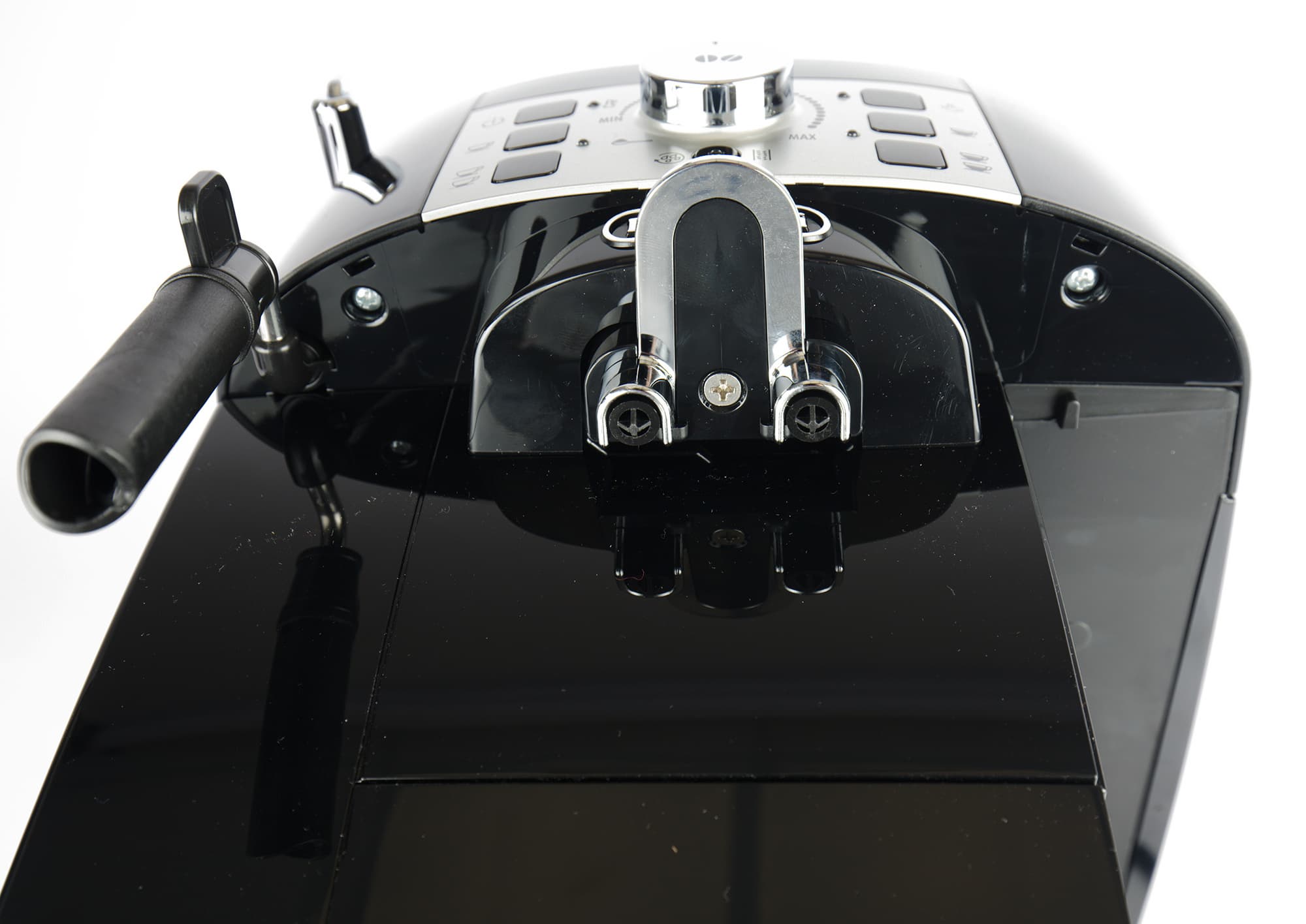 У диспенсера предусмотрена специальная ручка-захват. Слева мы видим пластиковое сопло капучинатора. Капучинатор можно поворачивать вправо-влево, а вот регулировать наклон (направлять его вверх-вниз) нельзя.