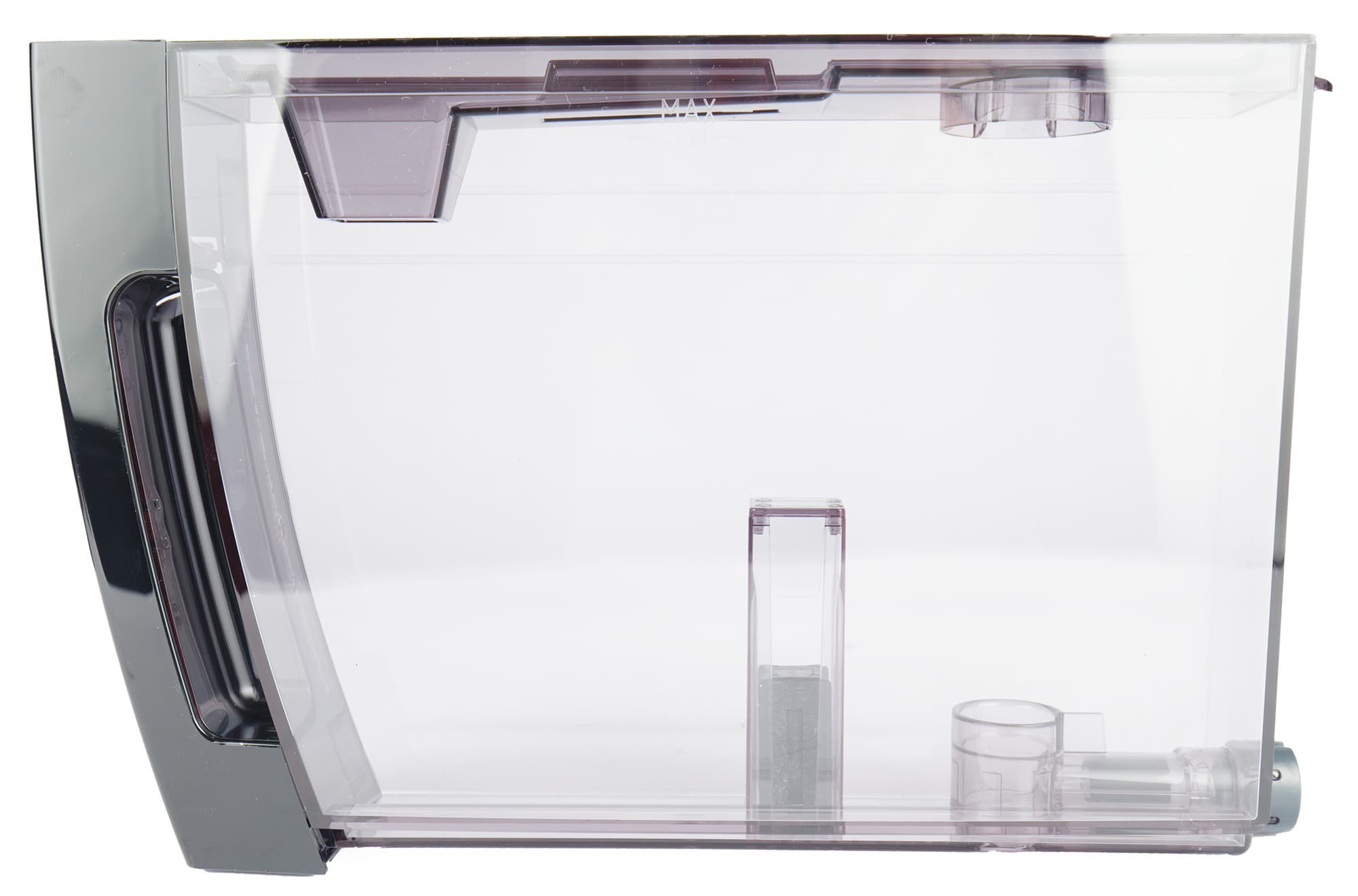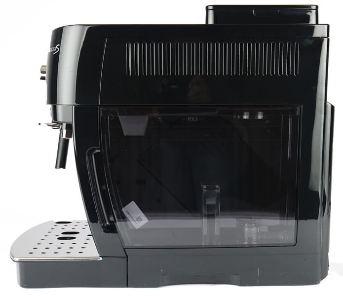 Контейнер для воды объемом 1,8 литра расположен справа, достается — спереди. В контейнере предусмотрена возможность установки фильтра смягчения воды. Сам контейнер легко (одной рукой) снимается и устанавливается на свое место. Вода заливается через небольшой отверстие сверху контейнера.