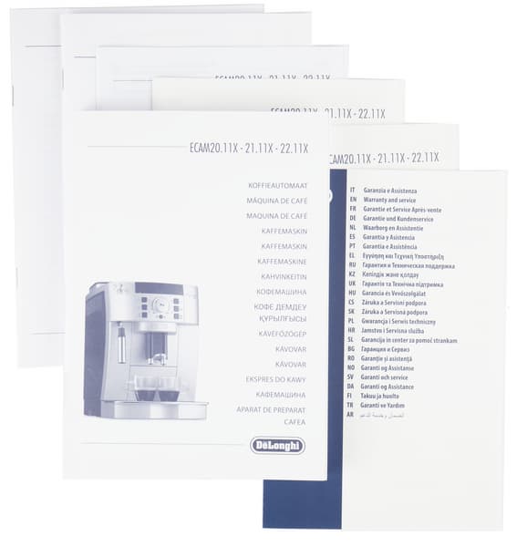 В комплекте с кофемашиной поставляется большое количество печатных материалов, из которых нас в первую очередь интересует, конечно, инструкция. Тут их нашлось несколько — для разных языков.
