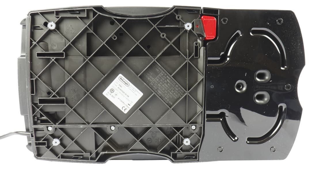 Не слишком интересная картина открывается и снизу: тут мы видим еще одну наклейку с информацией о модели. Красный пластиковый колпачок — это миниатюрный контейнер для сбора конденсата (он крепится к нижней части кофемашины).