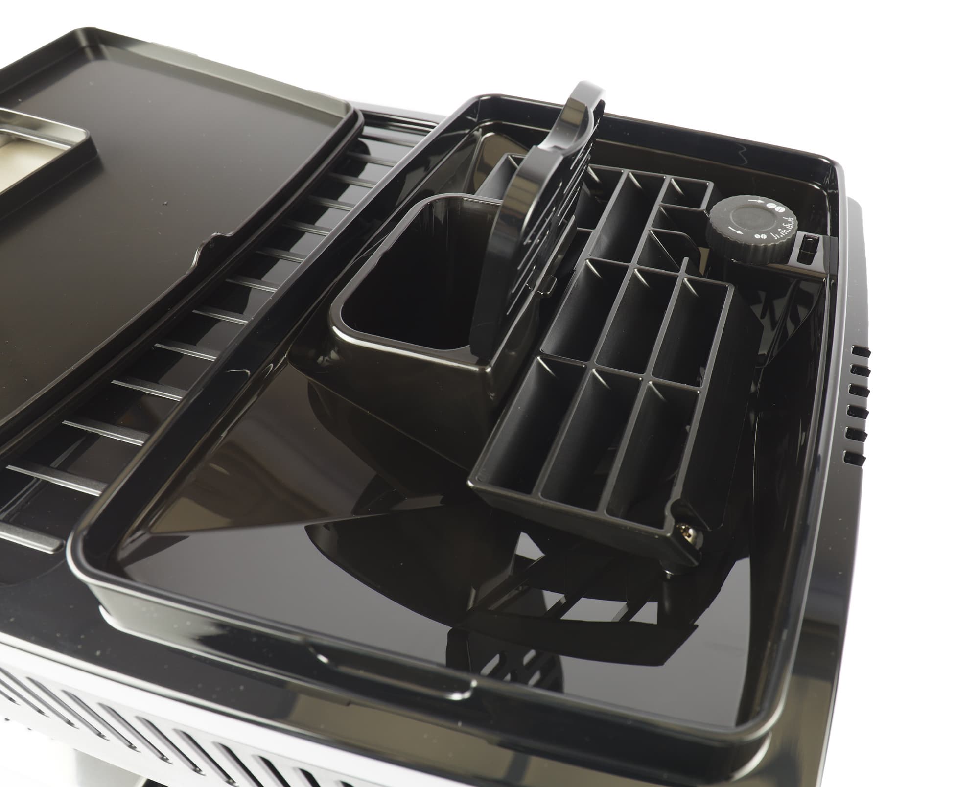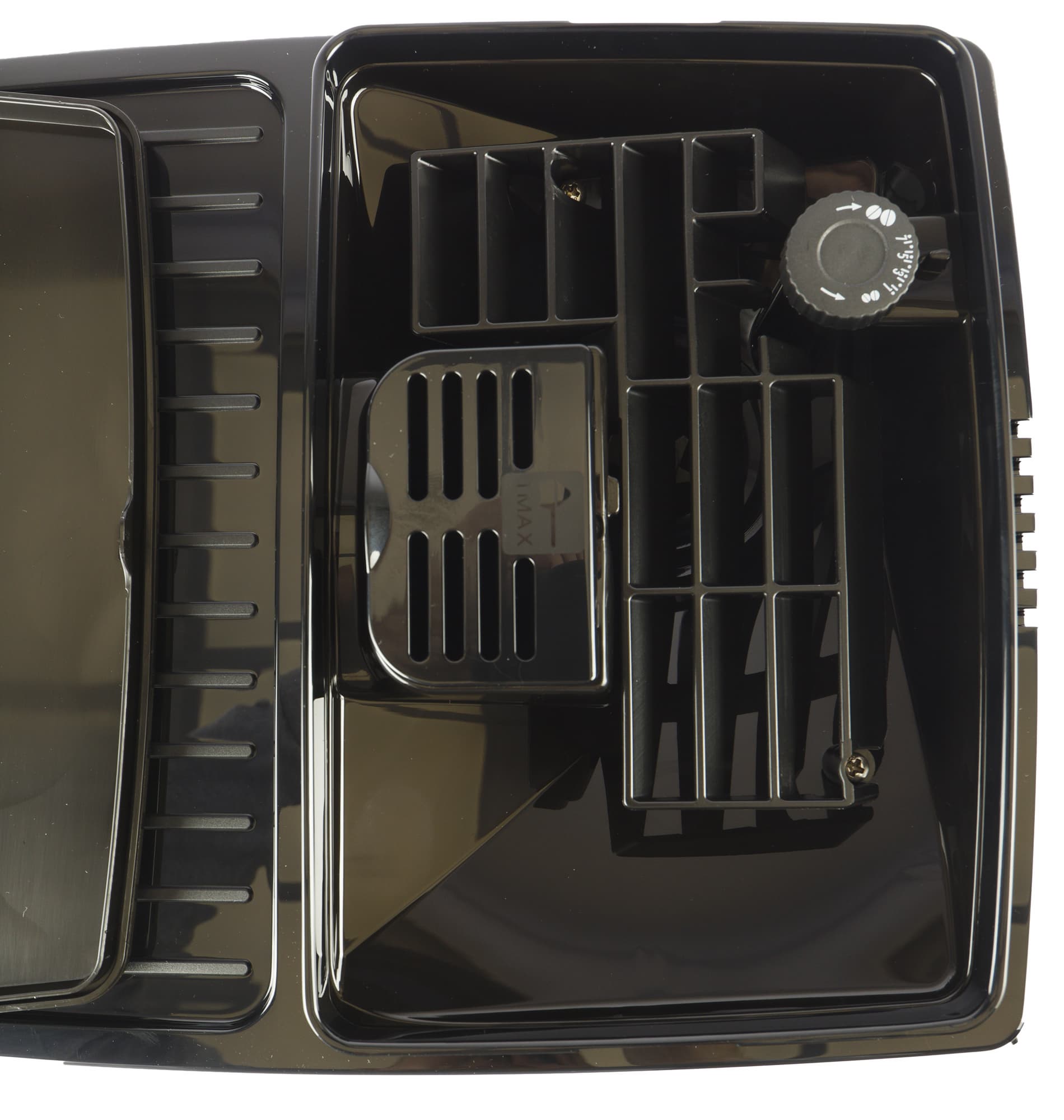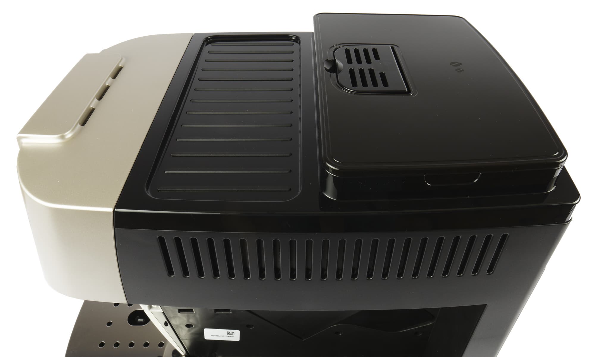 Сверху у нашего прибора находится пластиковая площадка для чашек (с пассивным подогревом), а также две крышки: маленькая открывает доступ к шахте для засыпки молотого кофе, крупная — снимается полностью и позволяет засыпать зерно.