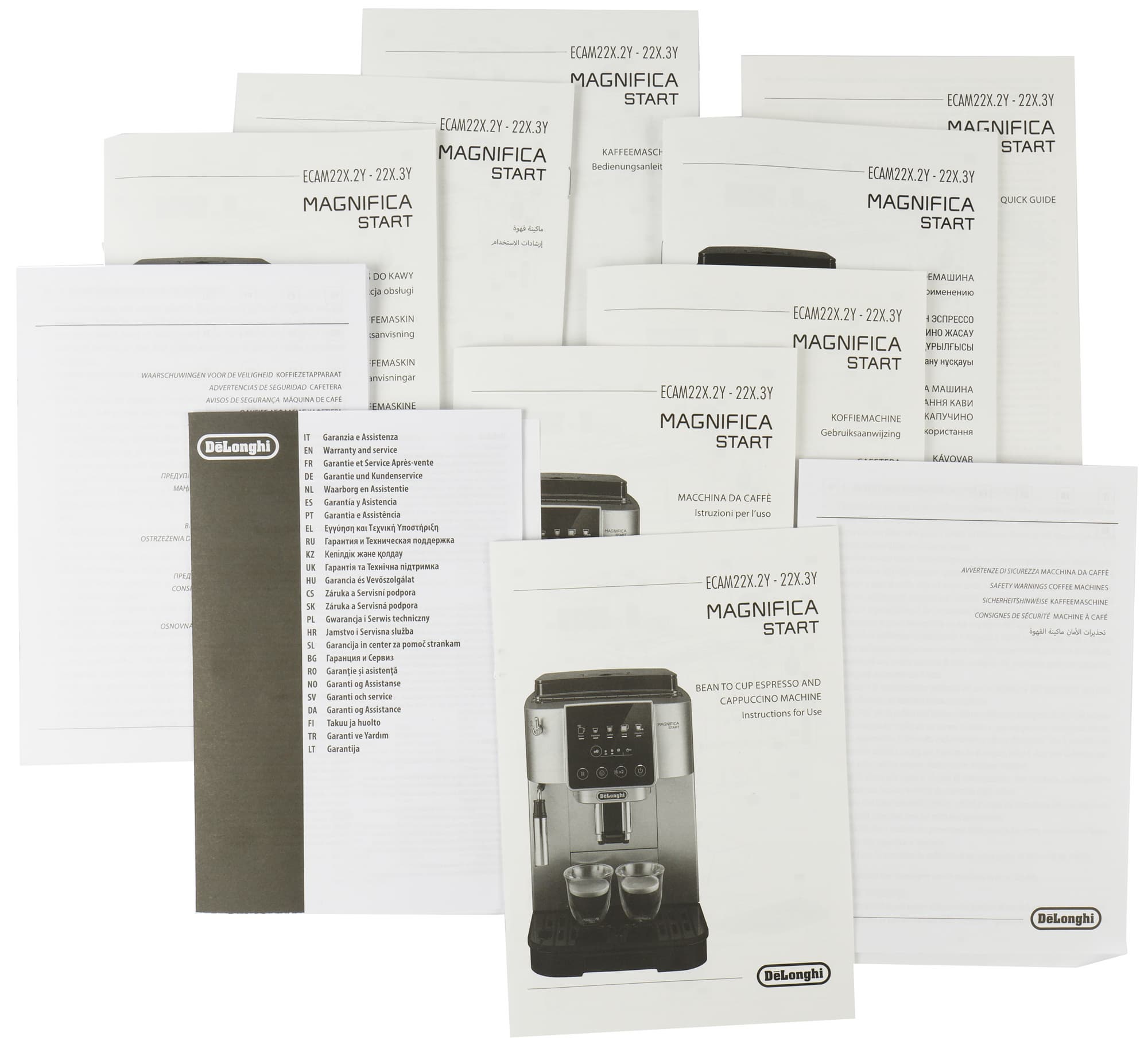 В комплекте с кофемашиной поставляется большое количество печатных материалов, из которых нас в первую очередь интересует, конечно, инструкция. Тут их нашлось несколько — для разных языков.