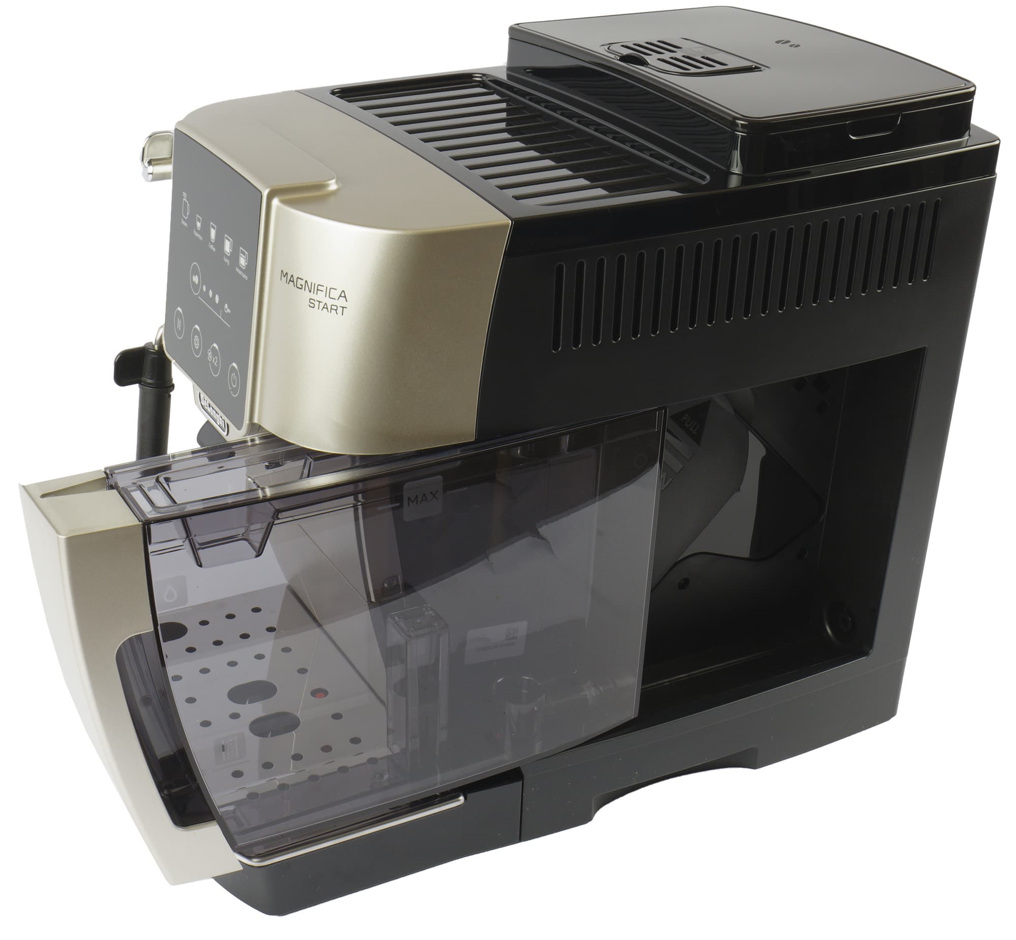При знакомстве кофемашина производит в целом неплохое впечатление. По меркам бюджетных моделей, к которым относится наша Magnifica Start, придраться и вовсе не к чему. Корпус у прибора в основном сделан из черного матового пластика и пластика, окрашенного под металл. Часть элементов глянцевая, присутствует и немного металла (мы сейчас говорим о поддоне для сбора капель). В общем, как водится у De’Longhi, все сделано на совесть. В том числе и то, что касается дизайна.