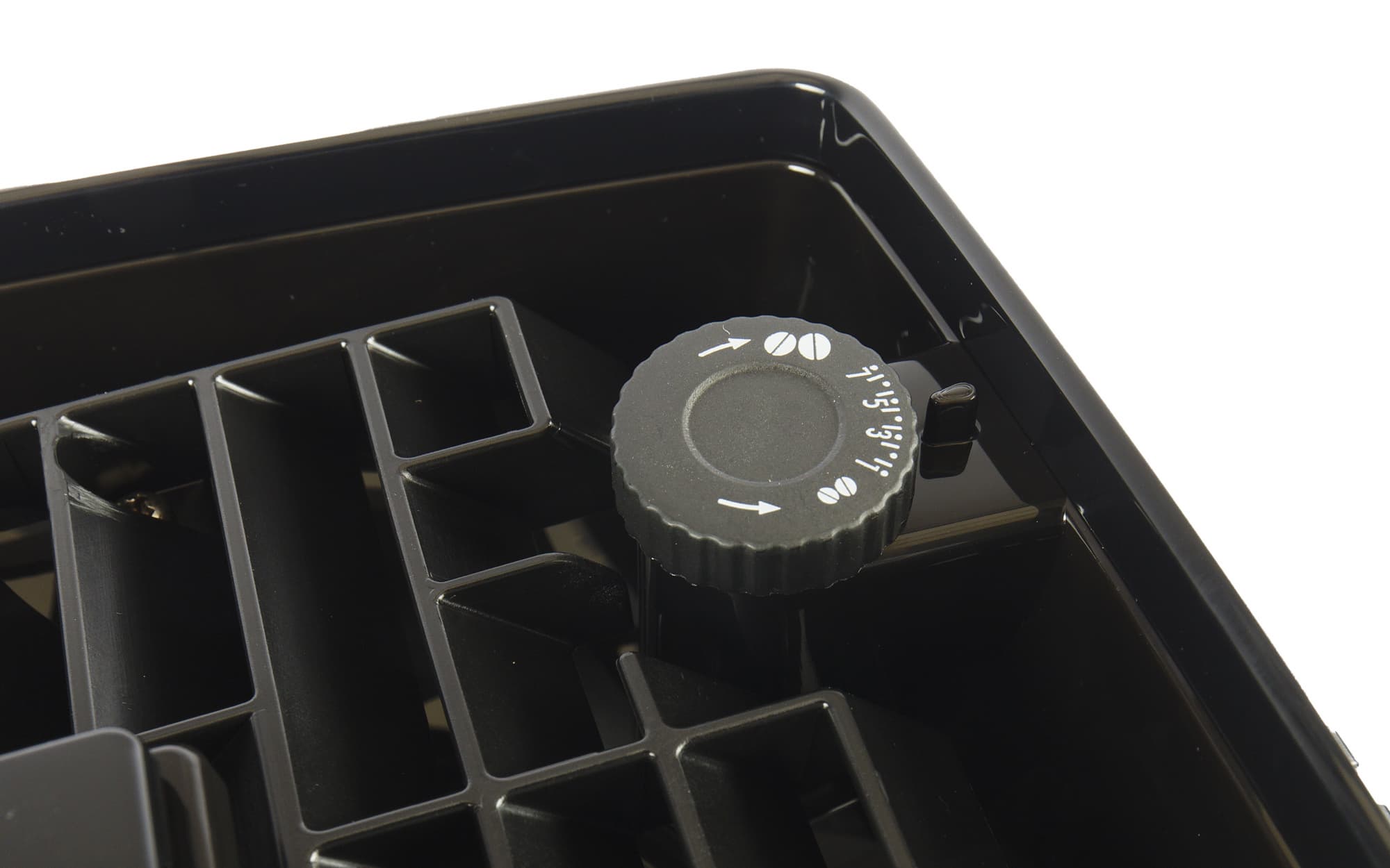 В левом дальнем углу — колесо настройки встроенной кофемолки (сама кофемолка находится под колесом, на фото ее не видно). В нашей машинке используется жерновая кофемолка с металлическими коническими жерновами и 13 степенями помола (такая используется у огромного количества современных кофемашин De’Longhi), так что каждый сможет подстроить помол в зависимости от сорта кофе и/или собственного вкуса.
