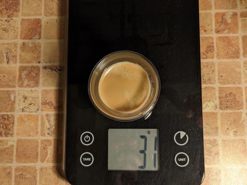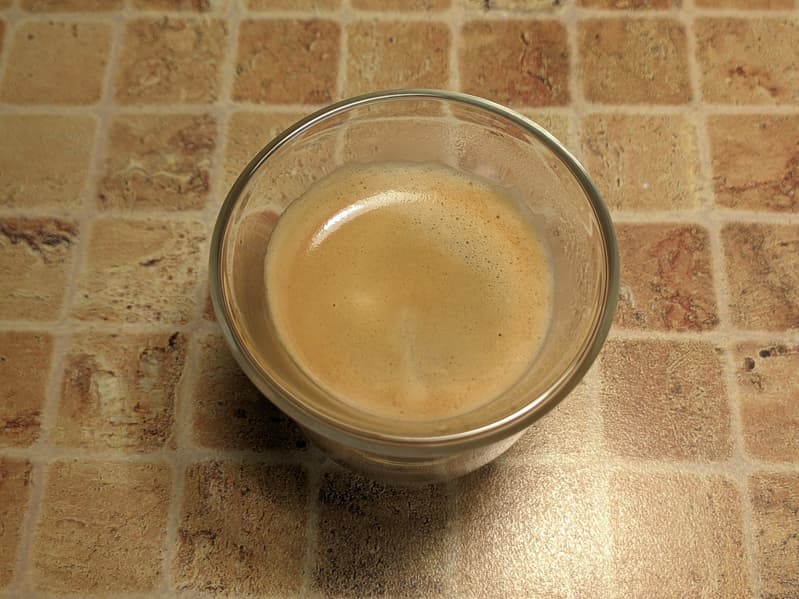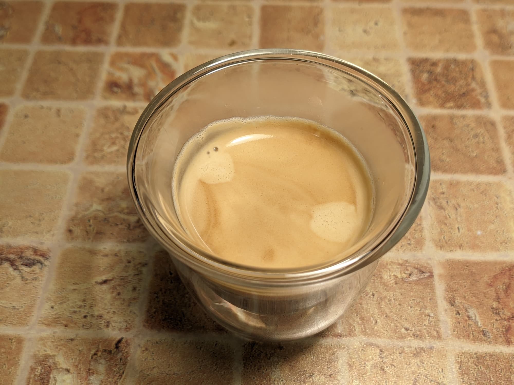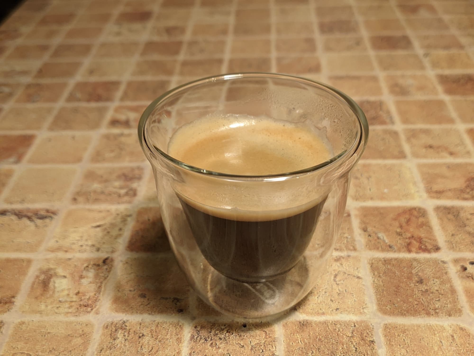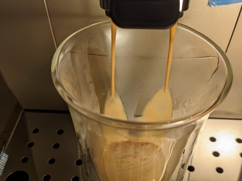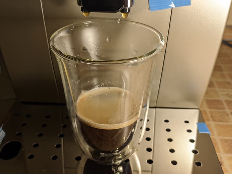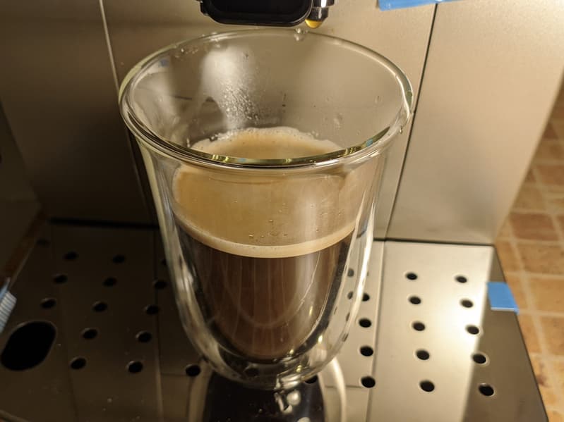 Классический эспрессо получается отличным (собственно, качество напитка тут будет то же самое, как и в других моделях, основанных на платформе ECAM). Машина предсмачивает кофе в течение 1 секунды, после чего выдает 40 мл напитка с симпатичной пенкой крема. На максимальных настройках крепости у нас получилось 31 грамм напитка.
