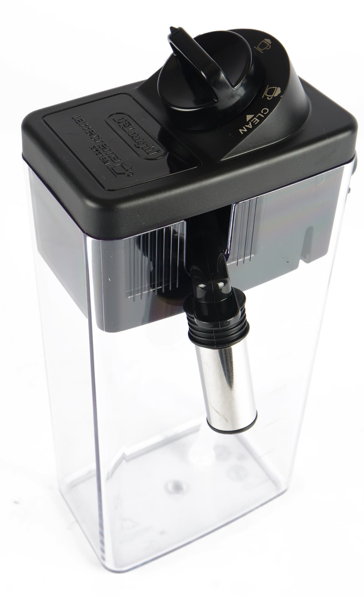 Кувшин-капучинатор наверняка хорошо знаком всем, кто уже сталкивался с продукцией De’Longhi. Это капучинатор системы LatteCrema с ручной регулировкой интенсивности подачи пены и с одинарными стенками (более современные модели нередко укомплектованы аналогичным кувшином с двойными стенками, что позволяет молоку дольше оставаться холодным).