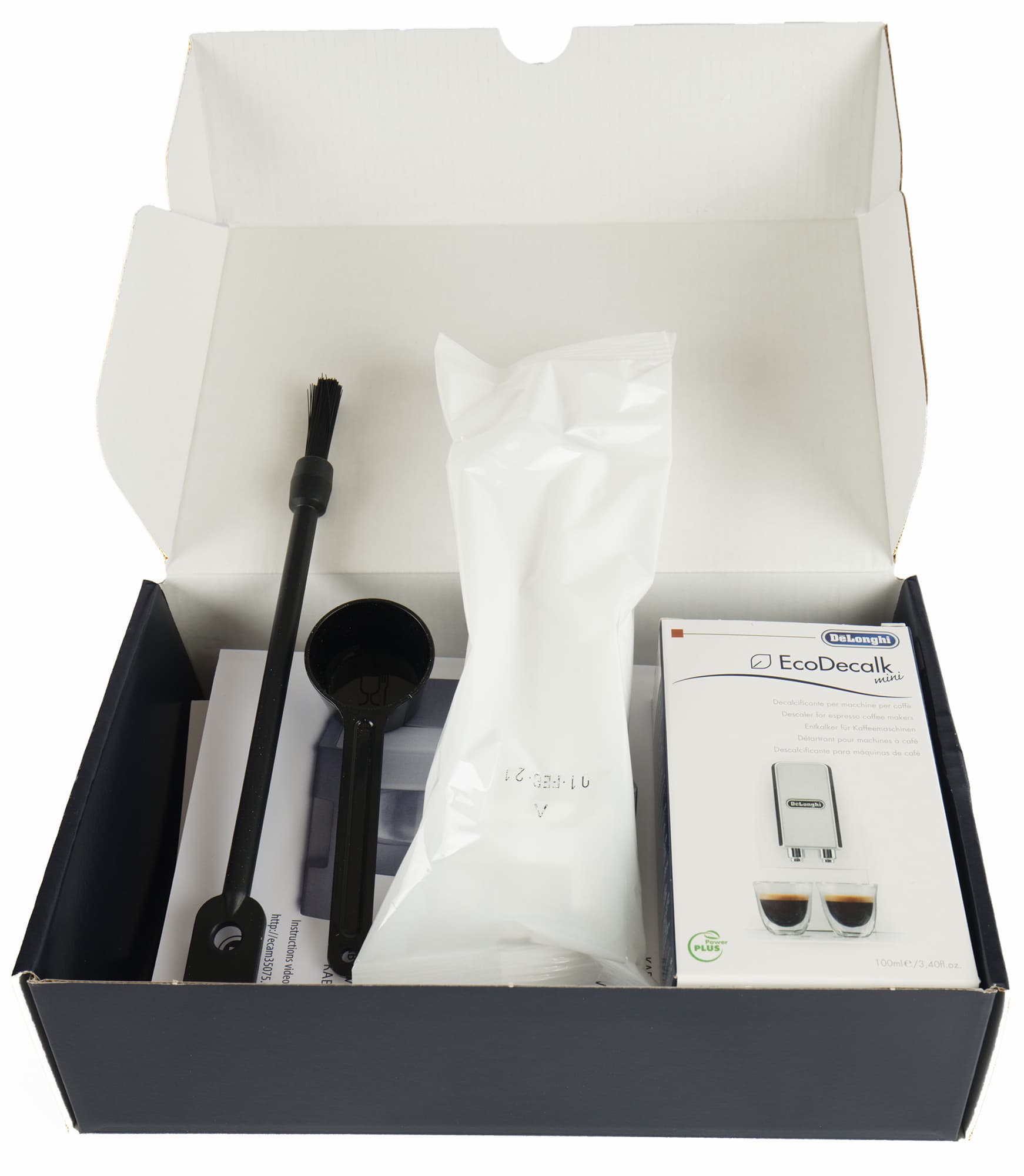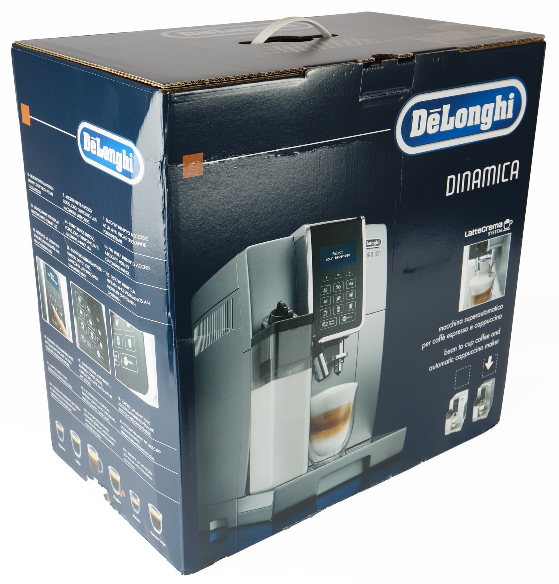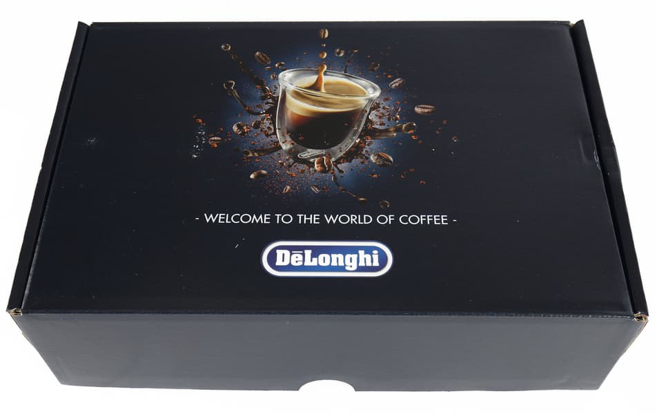 Кофемашина поставляется в объемной картонной коробке, оформленной в фирменном стиле De’Longhi: основной цвет — черный, дополнительный — темно-синий, печать полноцветная, фотографии высокого качества.