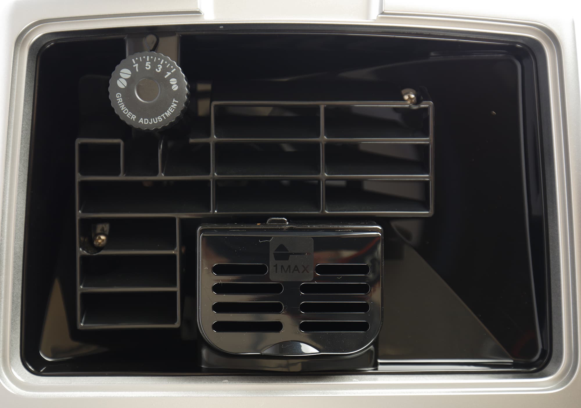 В левом дальнем углу — колесо настройки встроенной кофемолки (сама кофемолка находится под колесом, на фото ее не видно). В нашей машинке используется жерновая кофемолка с металлическими коническими жерновами и 13 степенями помола, так что каждый сможет подстроить помол в зависимости от сорта кофе и/или собственного вкуса.