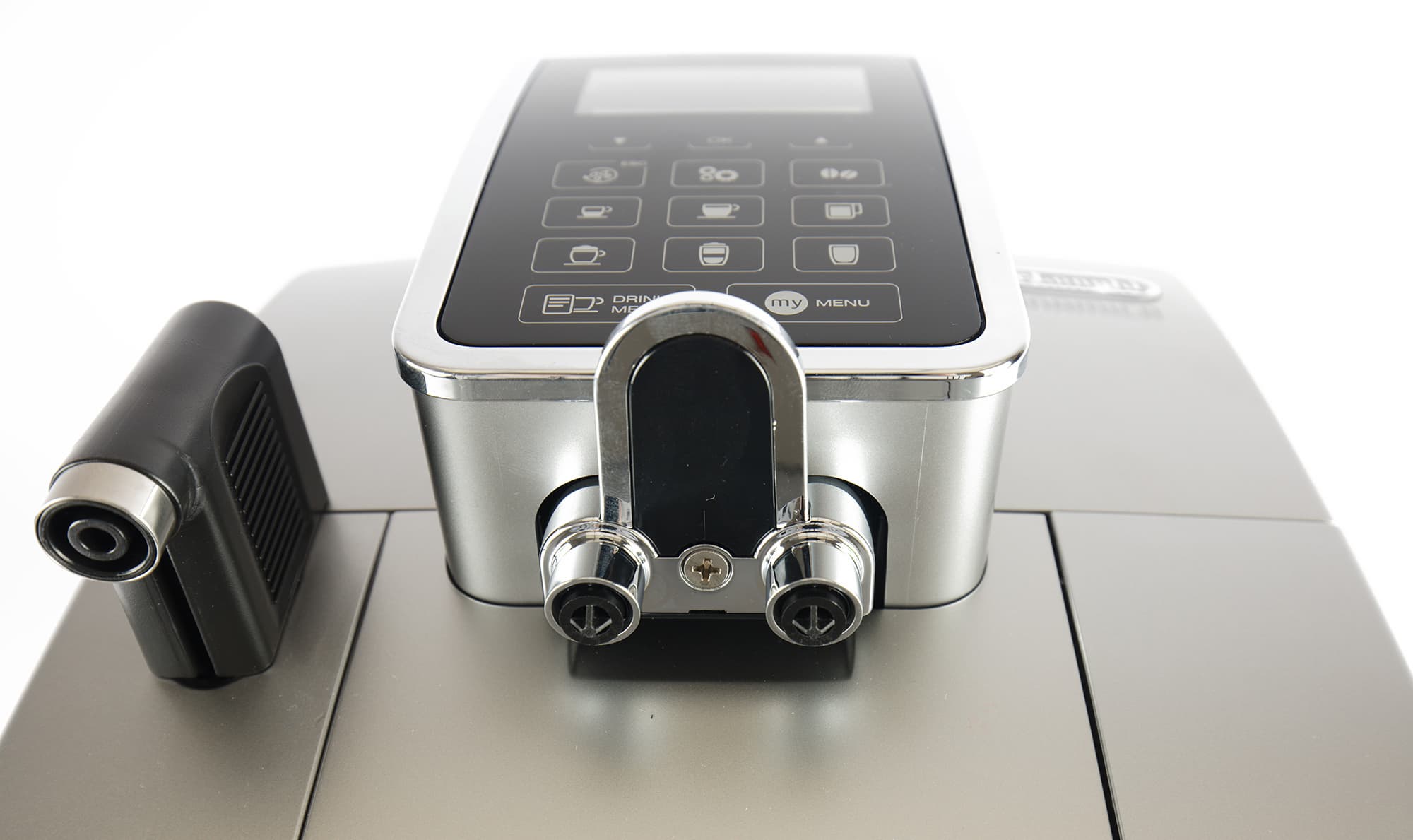 Спереди помимо блока управления выделяется разъем для установки крана подачи горячей воды (он же — разъем для подключения молочника) — слева и двойной диспенсер подачи напитка (прямо под сенсорными кнопками).