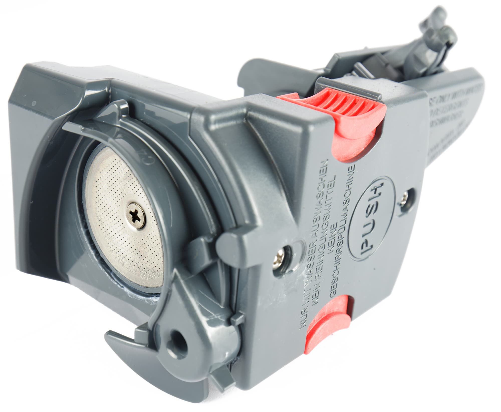 За контейнером для воды расположен скрытый пластиковый лючок, а за ним — компактный заварочный блок, легко извлекающийся для промывки под проточной водой.