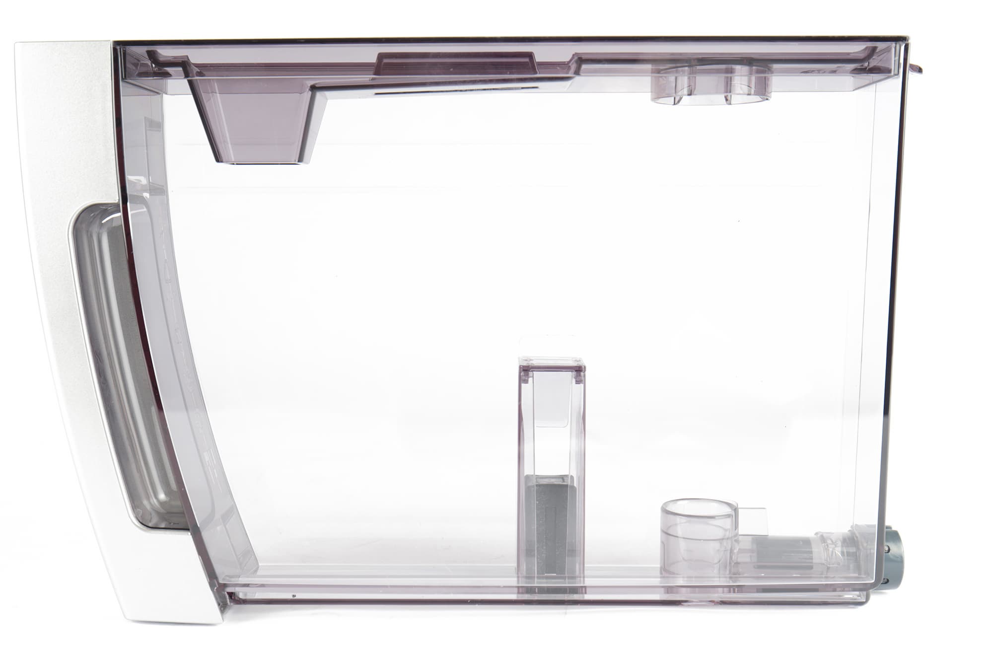Контейнер для воды объемом 1,8 литра расположен справа, достается — спереди. В контейнере предусмотрена возможность установки фильтра смягчения воды. Сам контейнер легко (одной рукой) снимается и устанавливается на свое место. Вода заливается через небольшой отверстие сверху контейнера.