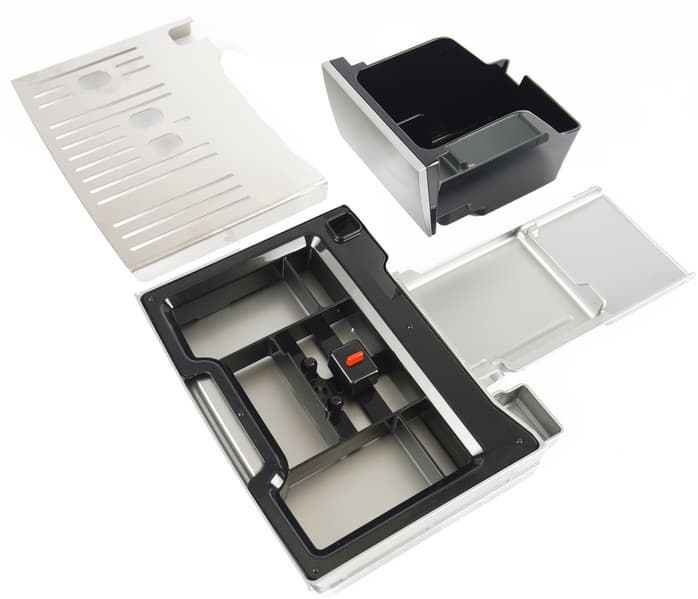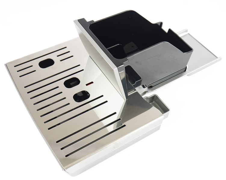 Спереди в нижней части устанавливается составной поддон металла и пластика. Сюда будет попадать лишняя влага (в том числе капли с диспенсера), а также в отдельный контейнер будут сбрасываться отработанные кофейные таблетки.