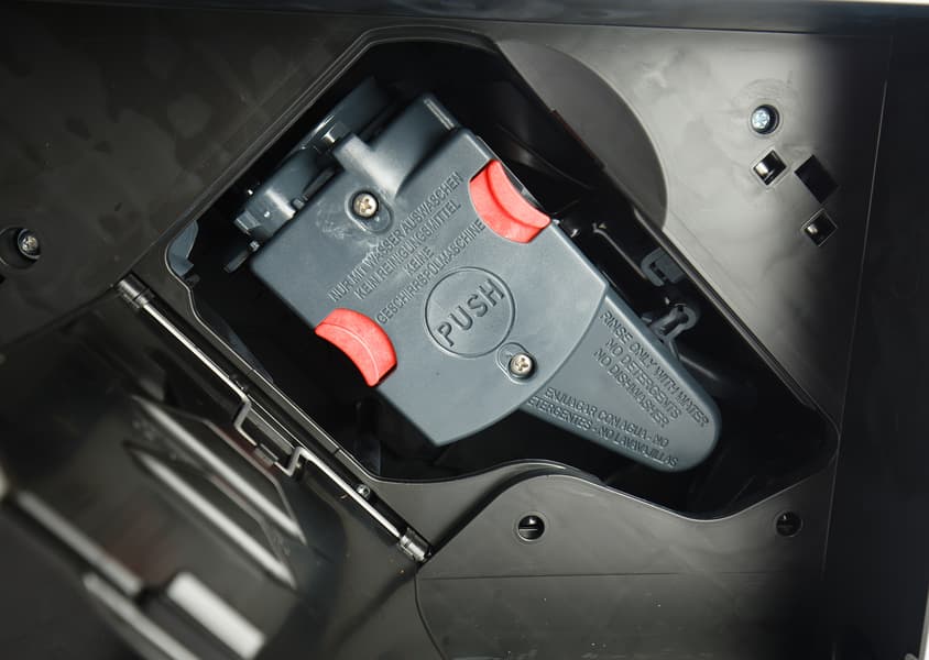 Контейнер для отходов вмещает около 14 порций (то есть нам придется опустошать его в среднем после приготовления 14 напитков). Достается контейнер спереди, вместе с отсеком для сбора капель. Насколько часто придется выливать воду — зависит от того, какие напитки вы предпочитаете готовить чаще (капучинатор нельзя надолго оставлять без запуска очистки, иначе молоко засохнет, а это — дополнительный расход воды).