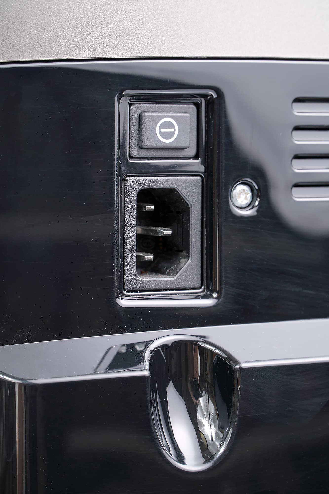 Самая неинтересная часть прибор — задняя. Тут можно увидеть наклейку с технической информацией, разъем для подключения шнура питания, кнопку включения/отключения и вентиляционные отверстия.