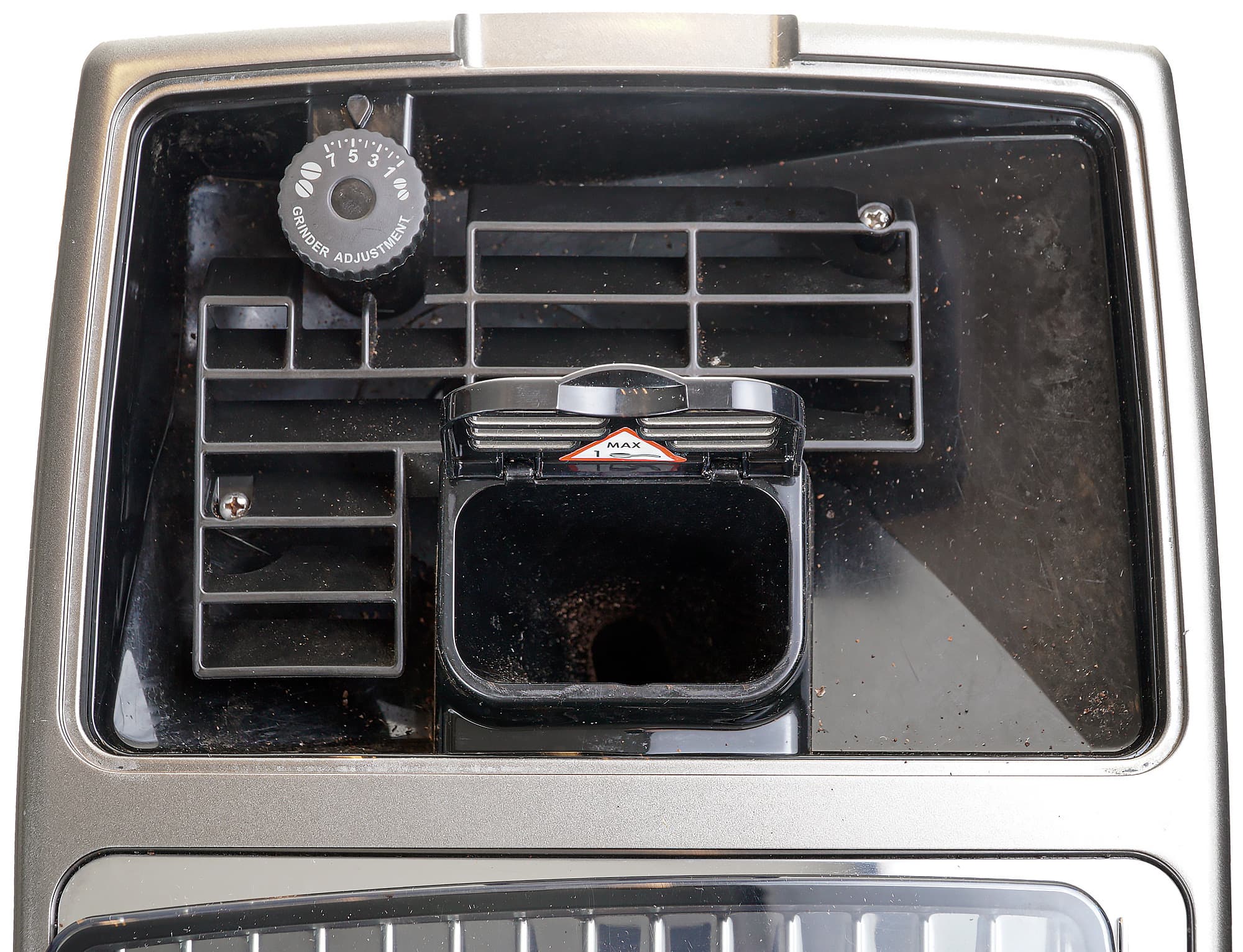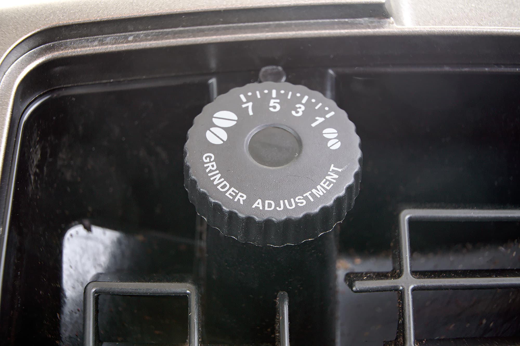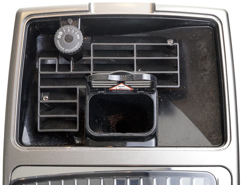 В левом дальнем углу — колесо настройки встроенной кофемолки (сама кофемолка находится под колесом, на фото ее не видно). В нашей машинке используется стальная жерновая кофемолка с 13 степенями помола, так что каждый сможет подстроить помол в зависимости от сорта кофе и/или собственного вкуса.