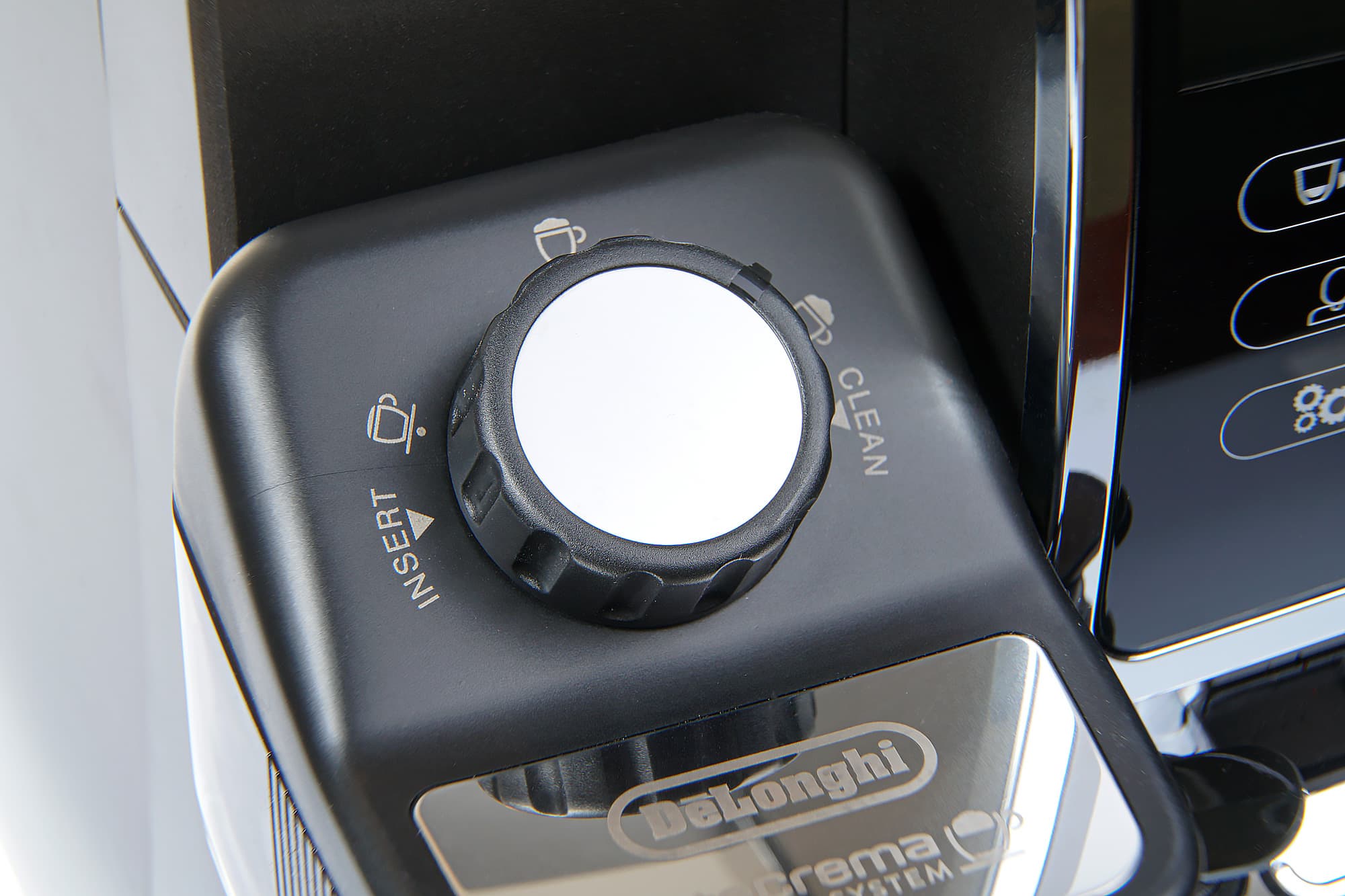 Управление кофемашиной осуществляется с помощью цветного сенсорного TFT-дисплея с диагональю 3,5 дюйма и набора из шести сенсорных кнопок. Правда, перед началом работы пользователю придется перевести в нужное положение переключатель на задней стенке (если он выключен), а затем включить кофемашину нажатием на механическую кнопку включения, расположенную сверху.