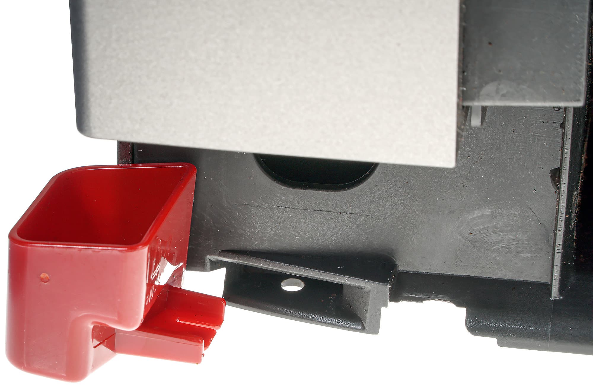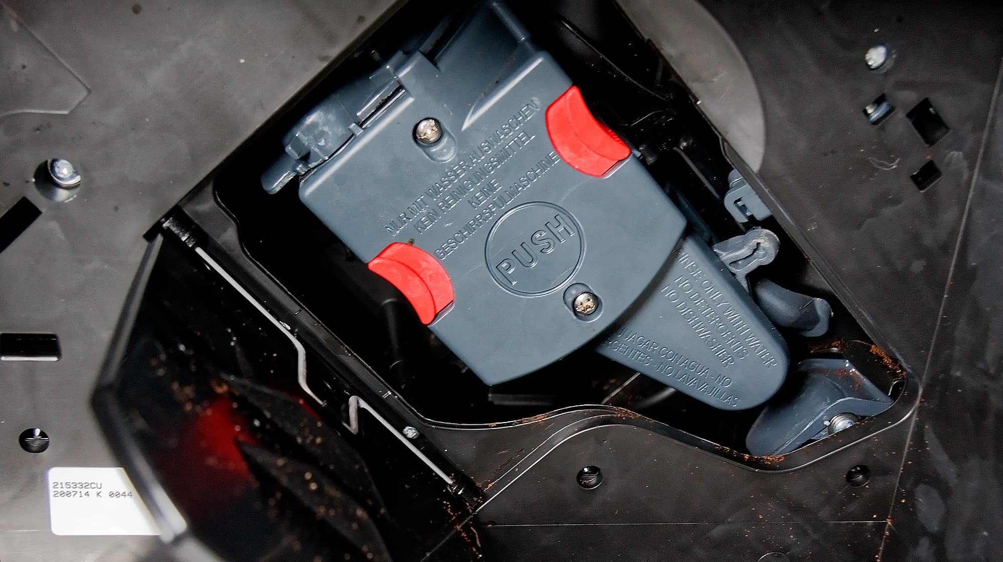 За контейнером скрывается пластиковый люк, а за люком — компактный заварочный блок, который, надо сказать, требует периодического извлечения и очистки. Снимается и устанавливается блок с помощью двух кнопок-защелок. Вместимость блока — до 14 граммов кофе.
