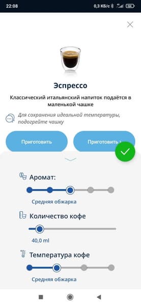 - Температура кофе — низкая, средняя, высокая, максимальная;