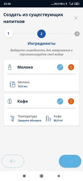 - Параметры напитков — в этом разделе можно просмотреть индивидуальные настройки и при необходимости привести каждый отдельный напиток каждого профиля к заводским параметрам;