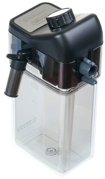 Внизу у нашего капучинатора находится контейнер с двойными стенками и градуировкой. В этот контейнер наливается молоко, которое автоматически подается через съемную резиновую трубку в крышку (которая, собственно, и является капучинатором).