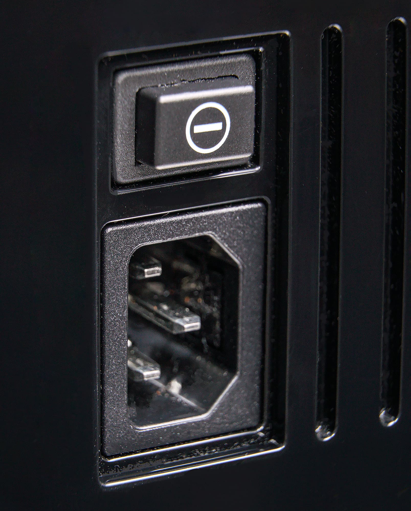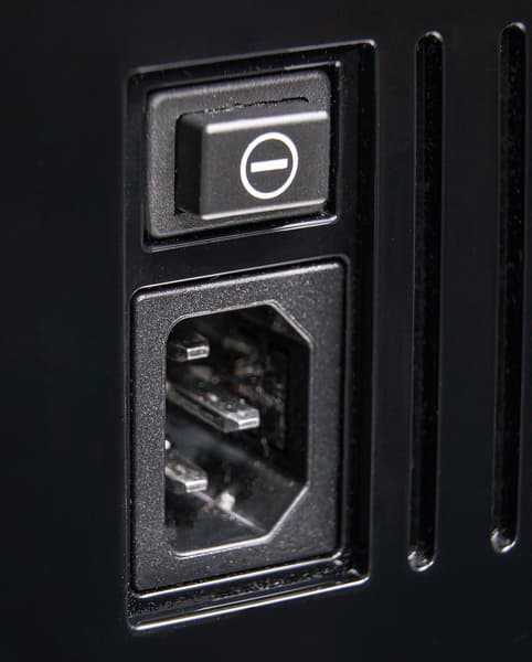 Кнопка включения/отключения в нашем случае механическая, разъем для подключения шнура питания — стандарта IEC (C13 и C14).