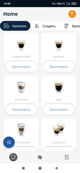 Находясь на главном экране, который появляется автоматически после того, как прибор будет готов к работе, пользователь может одним нажатием запустить приготовление выбранного рецепта (напитка), либо несколькими нажатиями — запустить нужный рецепт с внесением некоторых изменений.