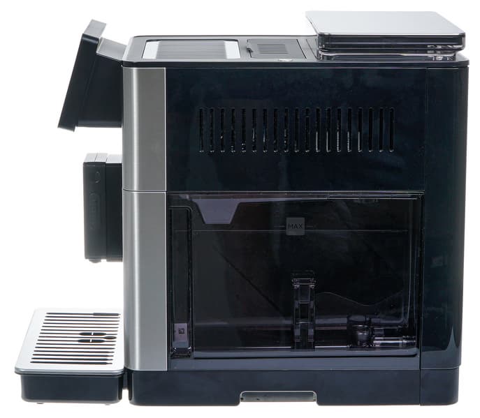 В плане «железа» тут не так много изменений по сравнению с младшими моделями. В первую очередь это, конечно, кофемолка с плоскими стальными жерновами и автоматической регулировкой степени помола, а из более заметного визуально — сенсорный экран с большей диагональю и вообще лучшего качества. Отметим также изменения типа съемного диспенсера, увеличенный бак для воды и специальный отсек для мерной ложки. Все они радуют и создают отчетливое впечатление, что пользоваться новой машиной удобнее, чем предыдущей. Остальные нововведения в данной модели касаются программной части: прибор стал гораздо дружелюбнее к новичкам и буквально «проведет за руку» для подбора оптимальных настроек машины в зависимости от сорта кофе. Особенно приятно, что настройки можно запомнить и вернуться к ним позже (это удобно, если у вас есть несколько любимых сортов кофе, которые вы хотите чередовать). Наличие настраиваемых пользовательских профилей и возможность изменения встроенных (и создания собственных) рецептов позволят настроить вкус различных напитков в полном соответствии с собственным вкусом. Ну а режим «Mug To Go» позволит настроить параметры любимого напитка для того, чтобы готовить целую кружку кофе в дорогу буквально в пару нажатий.