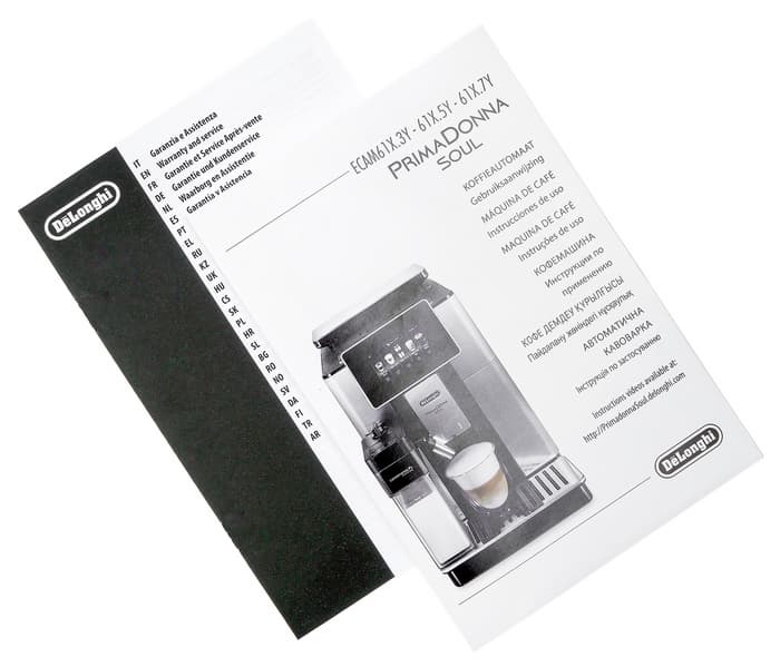 В комплекте с кофемашиной поставляется большое количество печатных материалов, из которых нас в первую очередь интересует, конечно, инструкция. Тут их нашлось несколько — для разных языков.