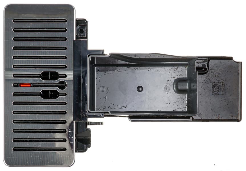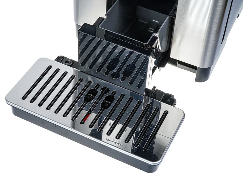 Контейнер для отходов вмещает около 18-20 порций (то есть, нам придется опустошать его в среднем после приготовления 18 напитков). Достается контейнер спереди, вместе с отсеком для сбора капель. Насколько часто придется выливать воду — зависит от того, какие напитки вы предпочитаете готовить чаще (капучинатор нельзя надолго оставлять без запуска очистки, иначе молоко засохнет, а это — дополнительный расход воды).
