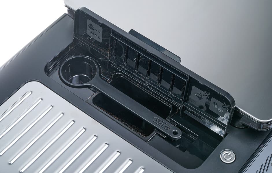 Также сверху расположен отсек для засыпки молотого кофе. Он закрывается на пластиковую крышку, мерная ложечка для кофе хранится внутри. Очень удобно: с учетом того, что прибор ориентирован в первую очередь на работу с зерновым кофе, предполагается, что молотый кофе будет использоваться не слишком часто. Так что если вдруг вы стали обладателем упаковки молотого кофе, то вам не придется вспоминать, куда вы убрали мерную ложечку: она всегда будет под рукой.