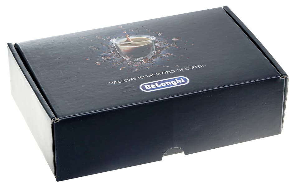 Объемная картонная коробка оказалась оформлена в фирменном стиле De’Longhi: основной цвет — черный, дополнительный — темно-синий, печать полноцветная, фотографии высокого качества.