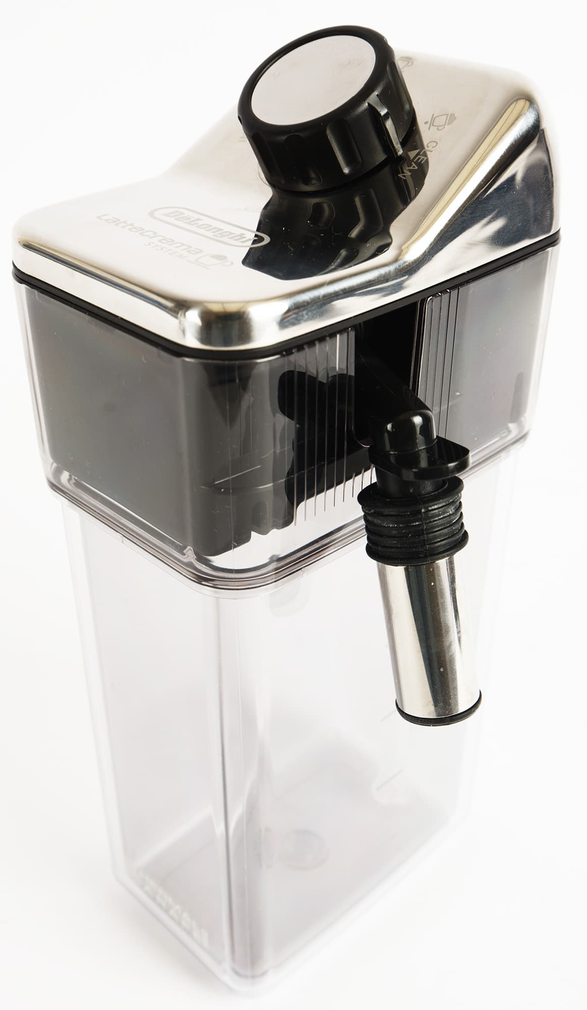 Кувшин-капучинатор у нашей кофемашине выглядит стандартно: это хорошо знакомый нам капучинатор системы LatteCrema с двойными стенками и ручной регулировкой степени вспенивания.