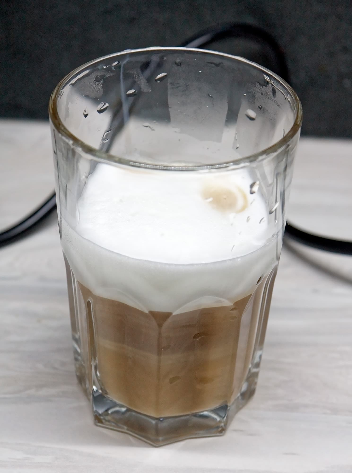 Уже после одной минуты взбивания молоко существенно увеличилось в объеме. Оно отлично подходит для использования в холодных напитках на основе кофе (и не только).